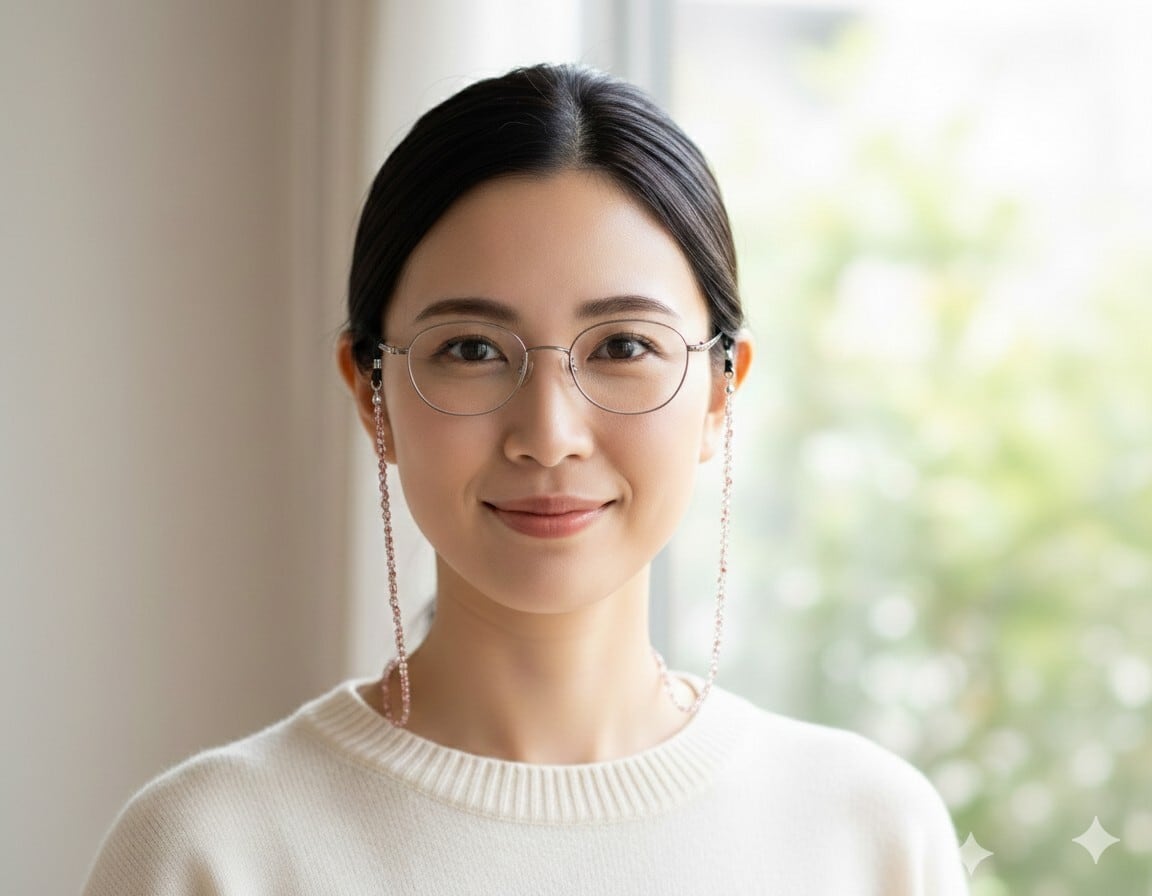 透明感のある美しい3ミリのチェコビーズを使用した〈A677 3ミリチェコビーズのメガネコード〉。きらめくビーズがお顔まわりをさりげなく彩り、上品さをプラスします。チェコビーズの間にはクリア色のガラス製粒ビーズが配置されており、全体に華やかさと統一感がございます。細やかなデザインがあなたのスタイルを引き立てる一品です。