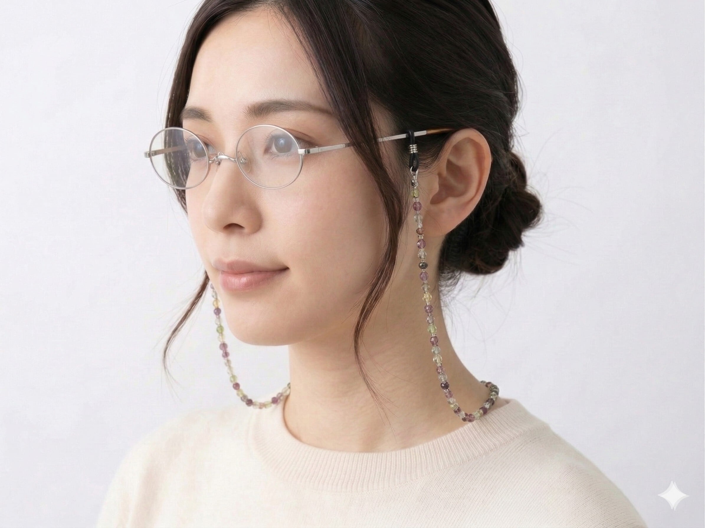 カラフルで魅力的なデザインの〈A682 4ミリチェコビーズ ミックスカラーのメガネコード〉。4ミリサイズのガラス製チェコビーズを3色ミックスし、それぞれのビーズの間にはライトグレー色のガラス製粒ビーズを挟みました。選び抜かれたカラーの組み合わせが、シンプルでありながら個性的な印象を与え、お顔まわりを華やかに彩ります。