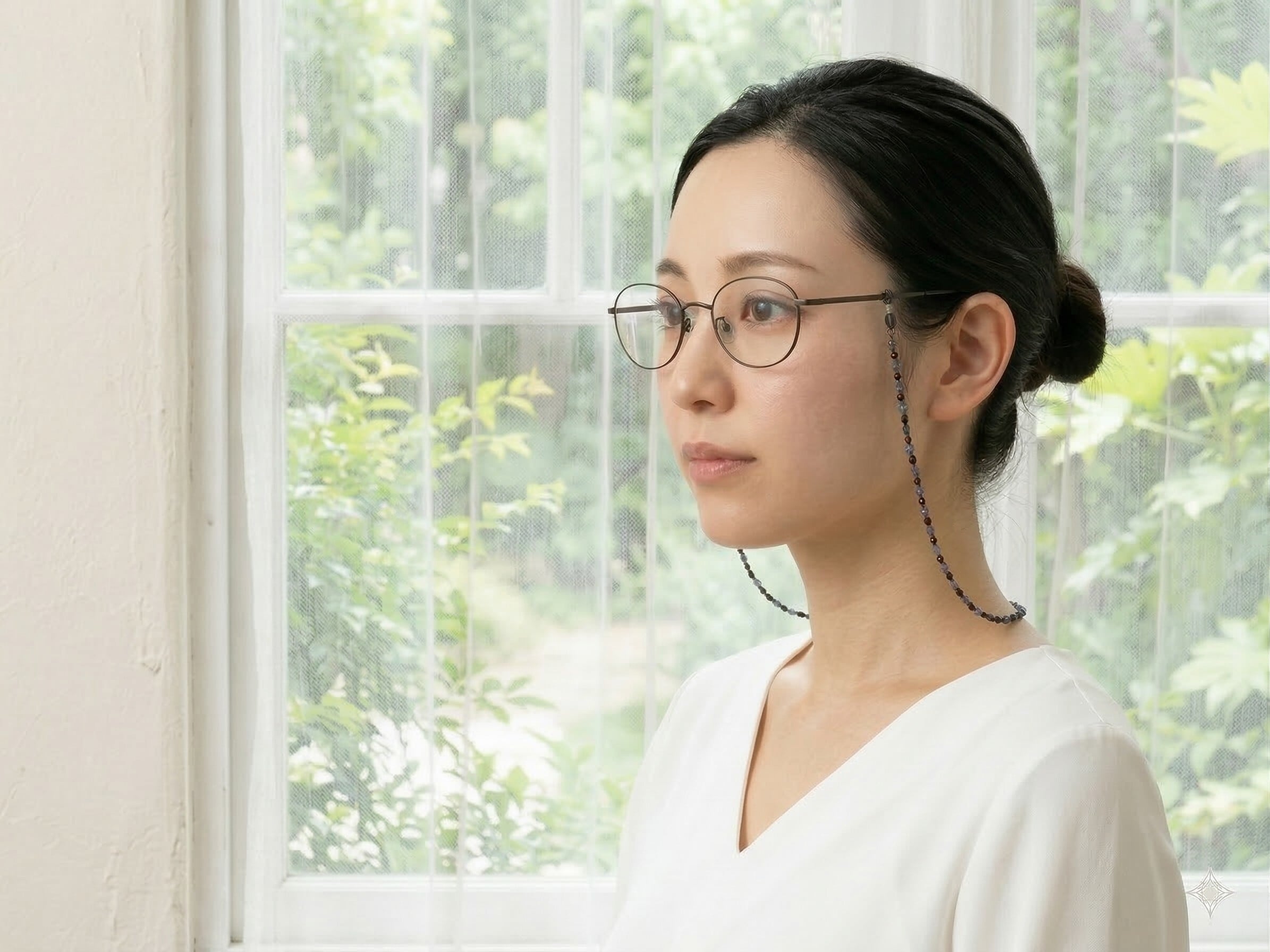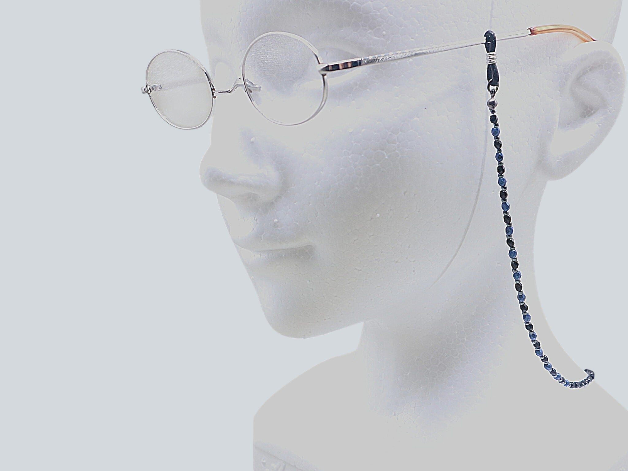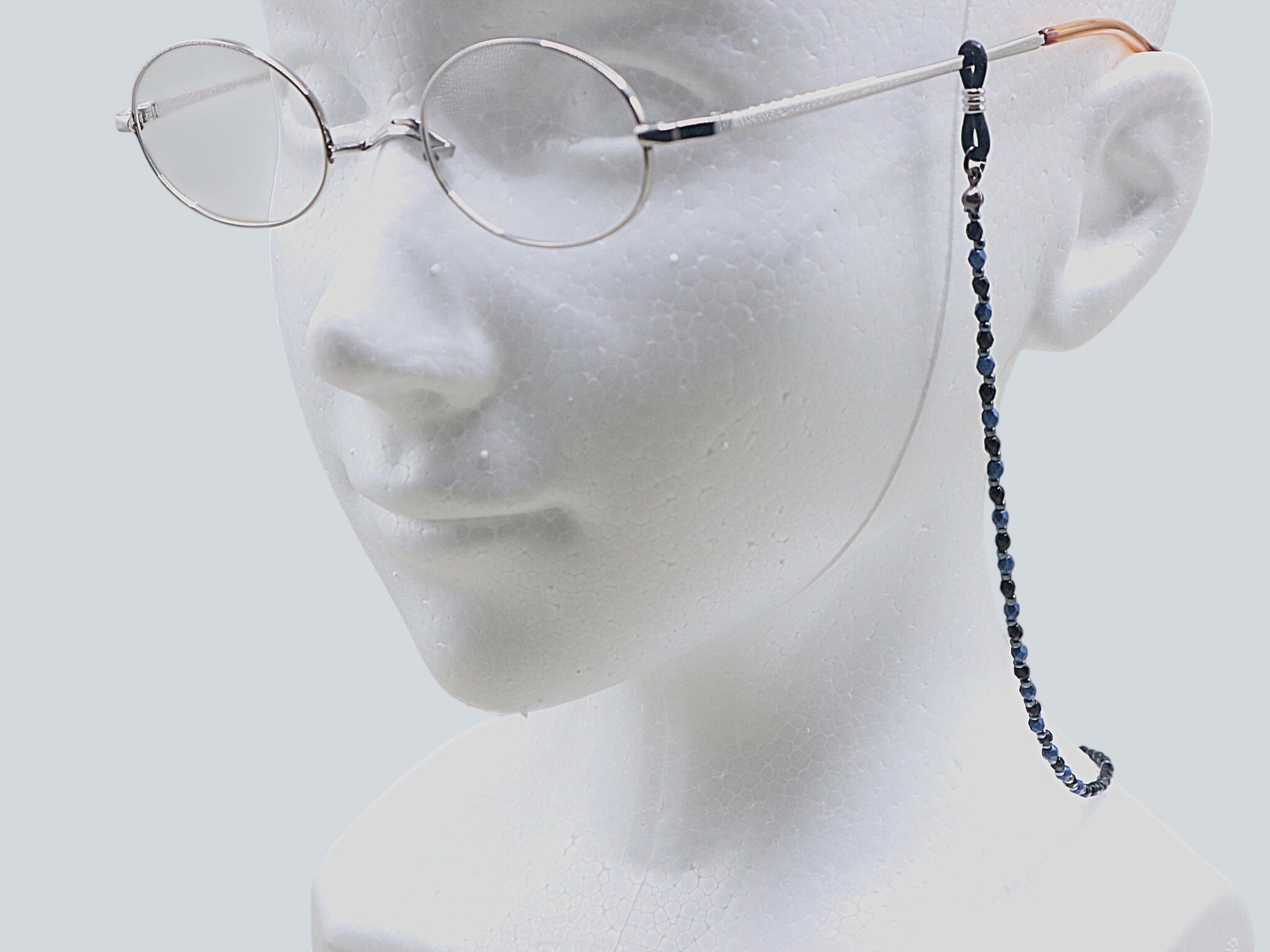 エレガントな雰囲気の〈A684 3ミリチェコビーズのメガネコード〉。3ミリのガラス製チェコビーズを使用し、左右両端にはそれぞれ約12CMの長さでカラーとブラックの2色のビーズを交互に配置。またチェコビーズの間にはそれぞれのカラービーズ(グリーン / パープル / ブルー) と同系色のガラス製粒ビーズを配し、シンプルな2色の配色が織り成すハーモニーが魅力です。絶妙なカラーのバランスが、あなたのお顔まわりを引き立てるアクセサリーに仕上がっています。