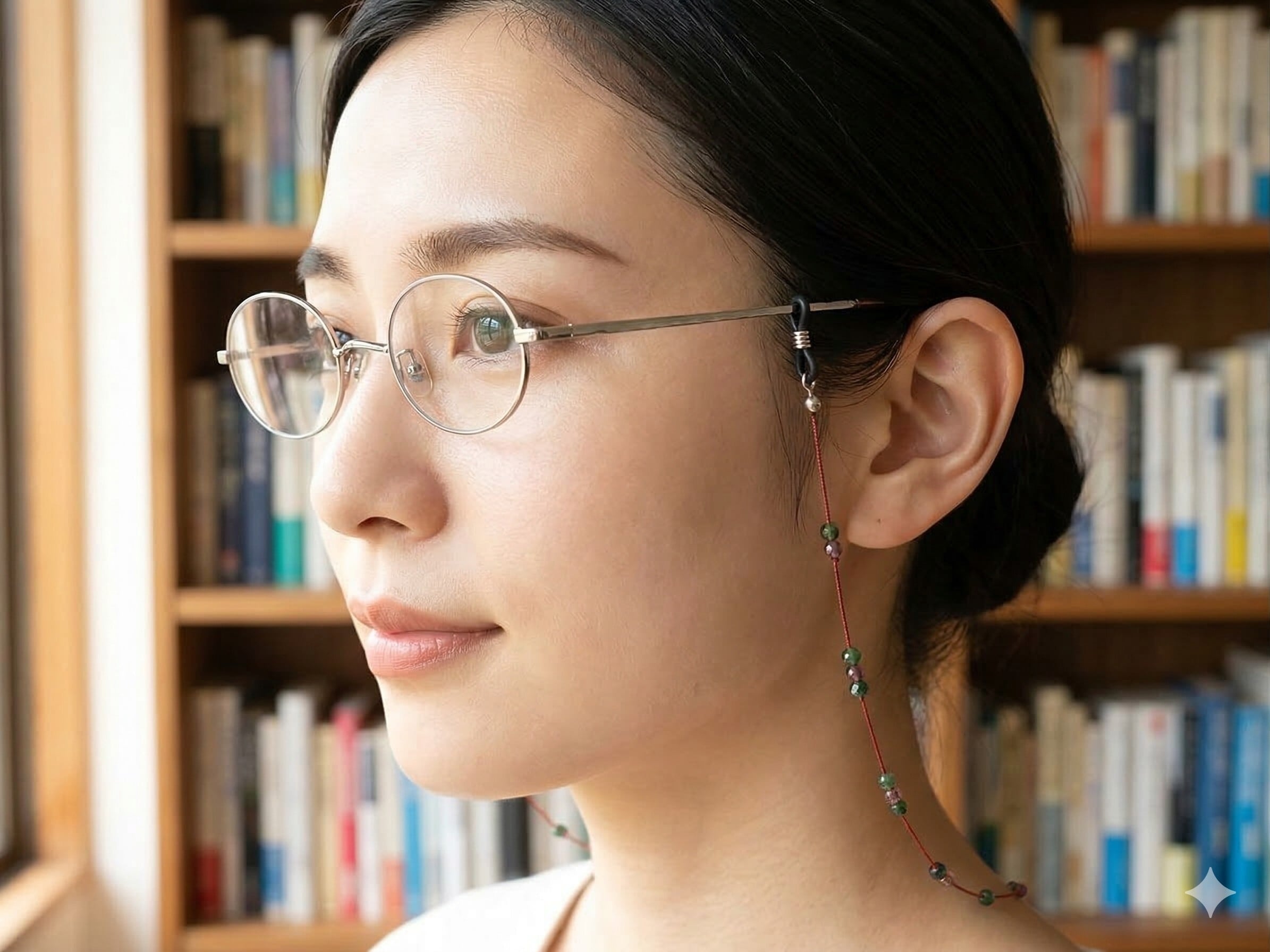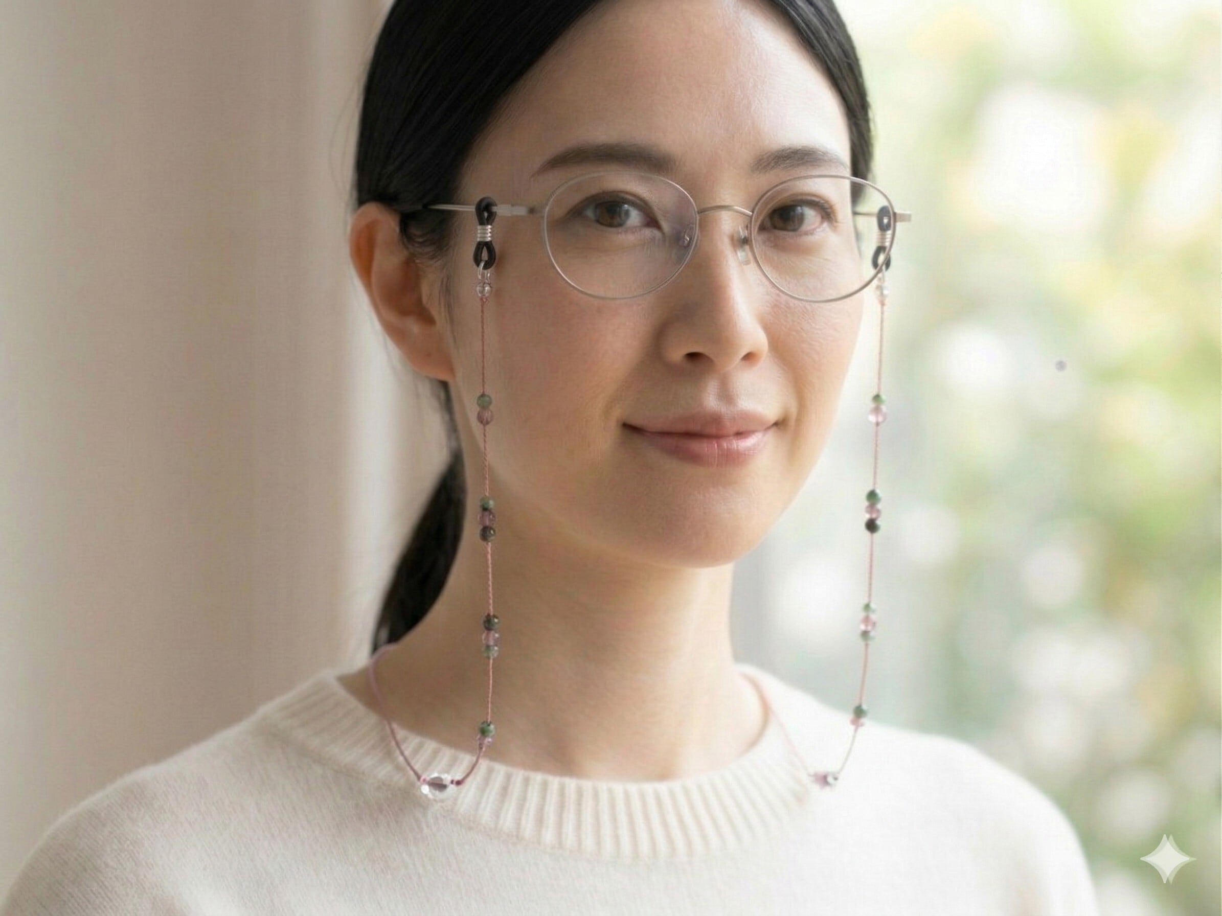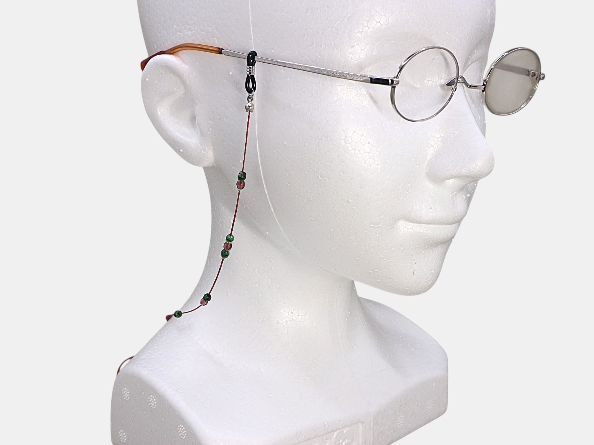 洗練されたデザインが魅力の〈A693 マーブル調チェコビーズと細紐のメガネコード〉。マーブル調のツートングリーンのチェコビーズとパープルやブラックのチェコビーズが絶妙に組み合わさり、華やかさと落ち着きを感じさせてくれます。あなたのメガネに個性的で上品なアクセントを加えることができるでしょう。