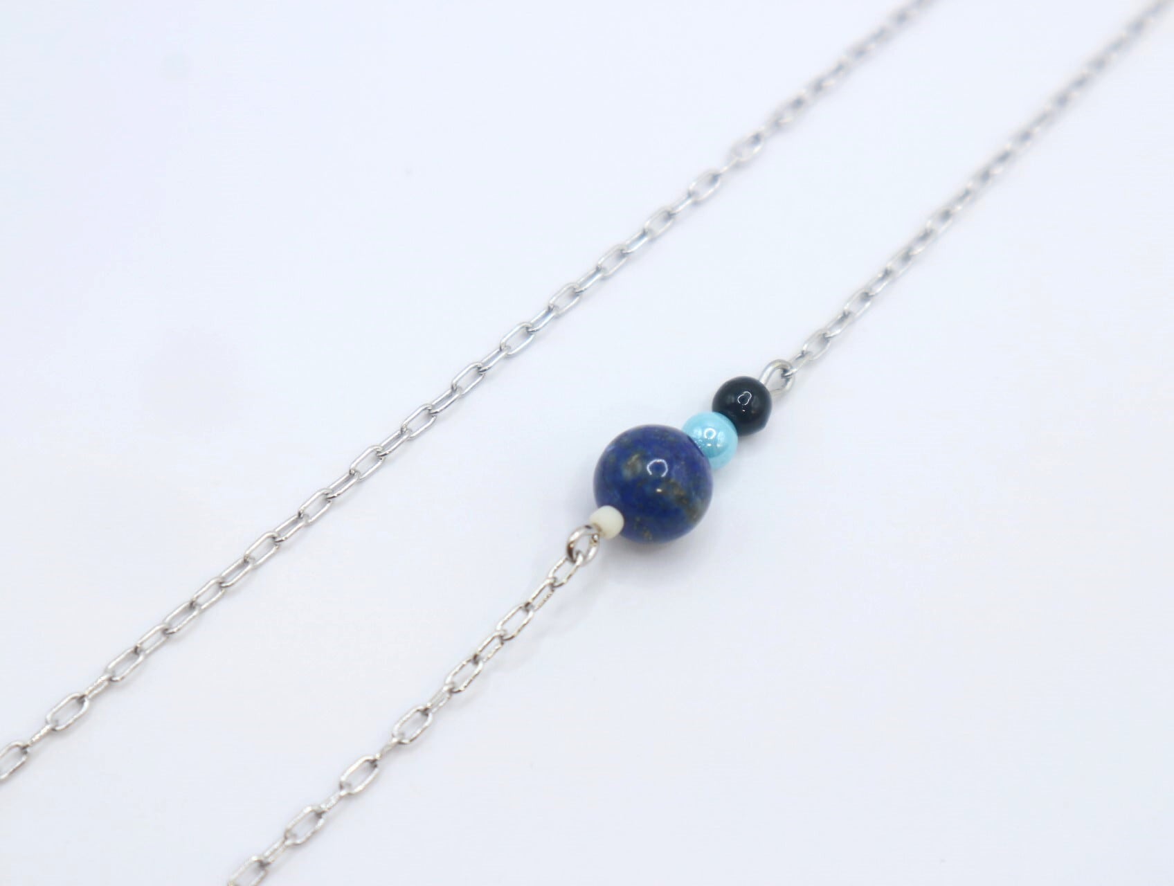 〈シルバー/ブルー〉丹銅製つやシルバーのチェーンx直径約8ミリのラピスラズリx約4ミリのチェコビーズx約4ミリのオニキス