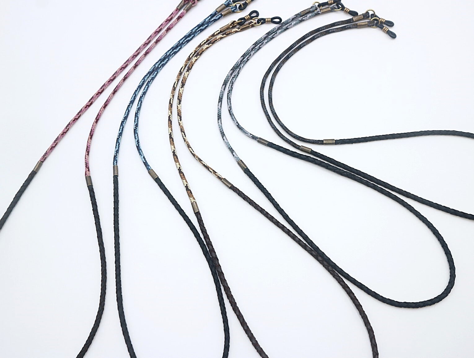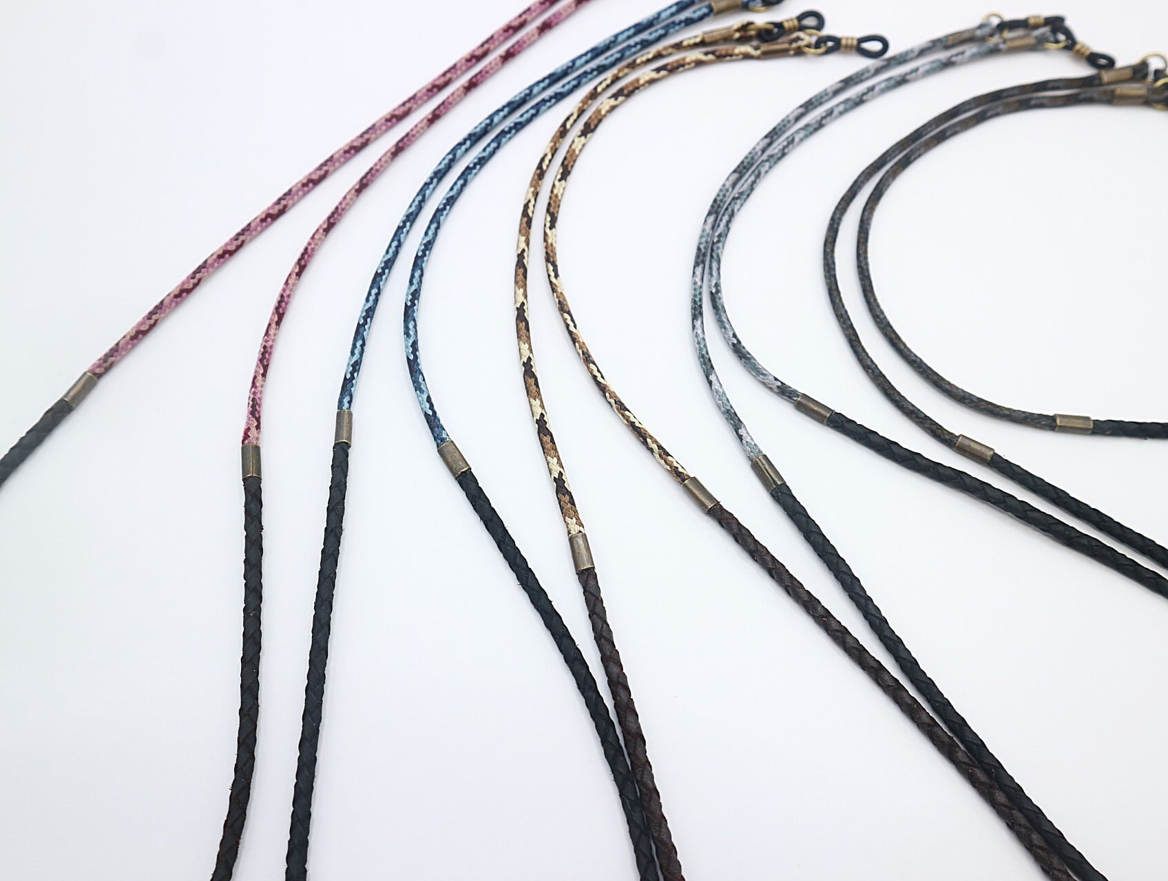 アクティブなスタイルを演出する〈A536 迷彩柄の丸紐と本革のメガネコード〉。迷彩柄の丸紐と、しっかりとした4つ編みの本革ひもが絶妙に組み合わさり、個性的でありながらも洗練された印象を与えます。異素材のコンビネーションが見事に調和した、遊び心満載のアイテムです。