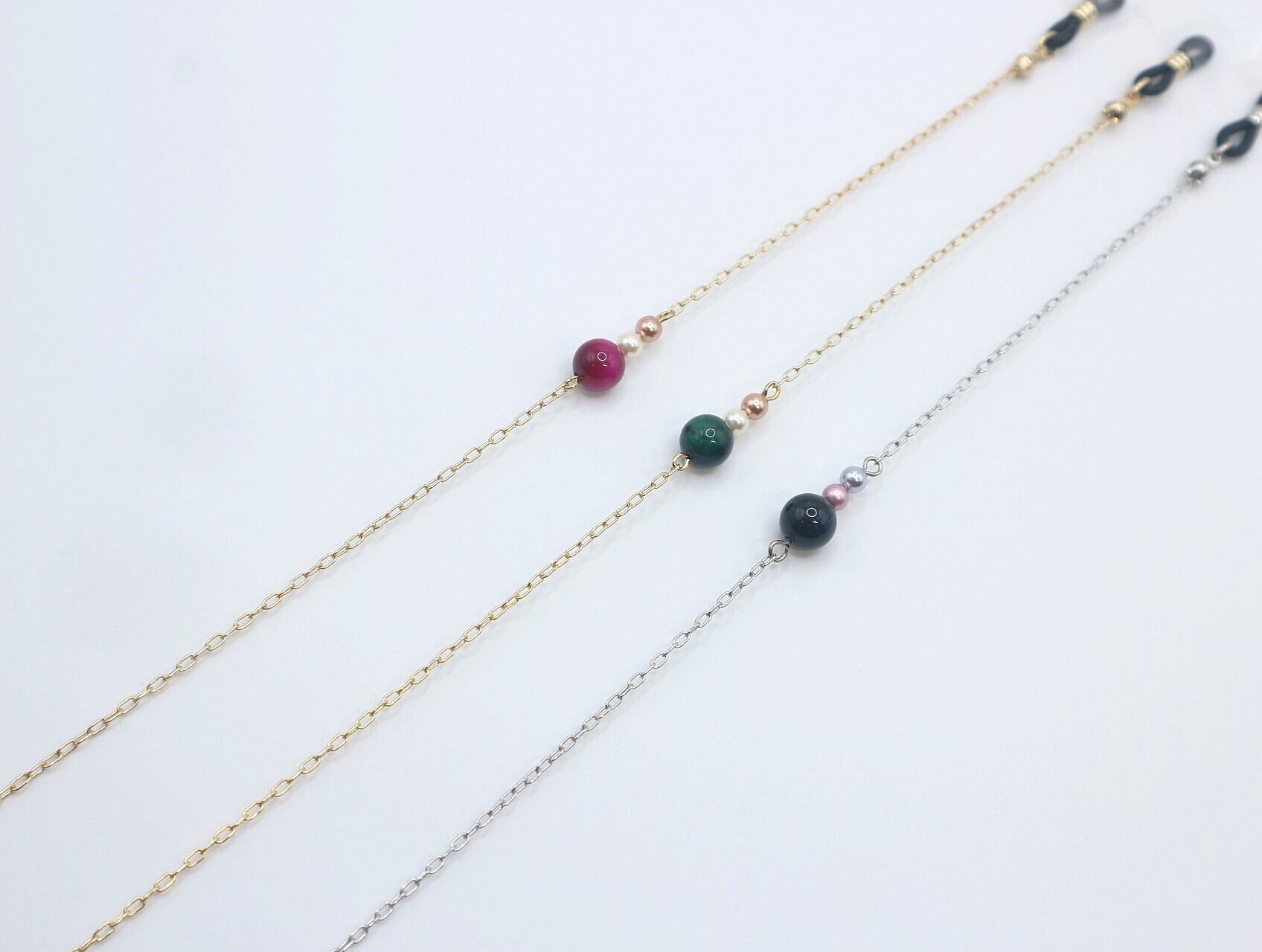 A553 カラータイガーアイ&パールガラス とメタルチェーンのグラスコード