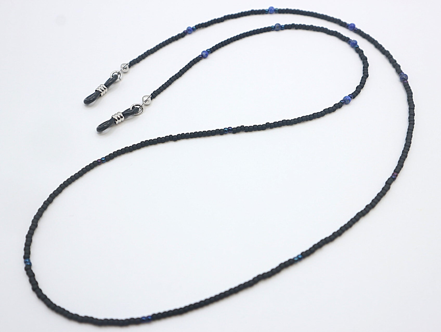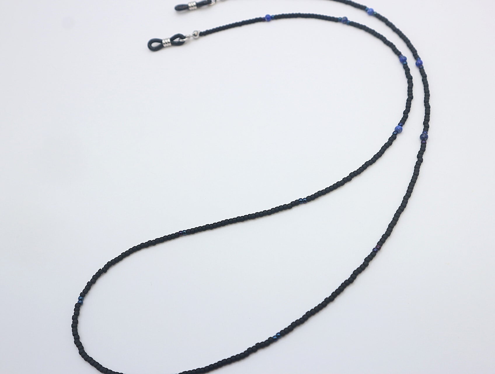 洗練されたデザインが魅力の〈A542 天然石と艶消しブラック粒ビーズのメガネコード②〉。つや消しブラックの粒ビーズが全体をスタイリッシュに引き立て、直径約3ミリのラピスラズリが特有の深い色合いと質感を添えます。首回り部分にはブルーの粒ビーズがアクセントとして加わり、スタイリングに鮮やかさをプラスします。