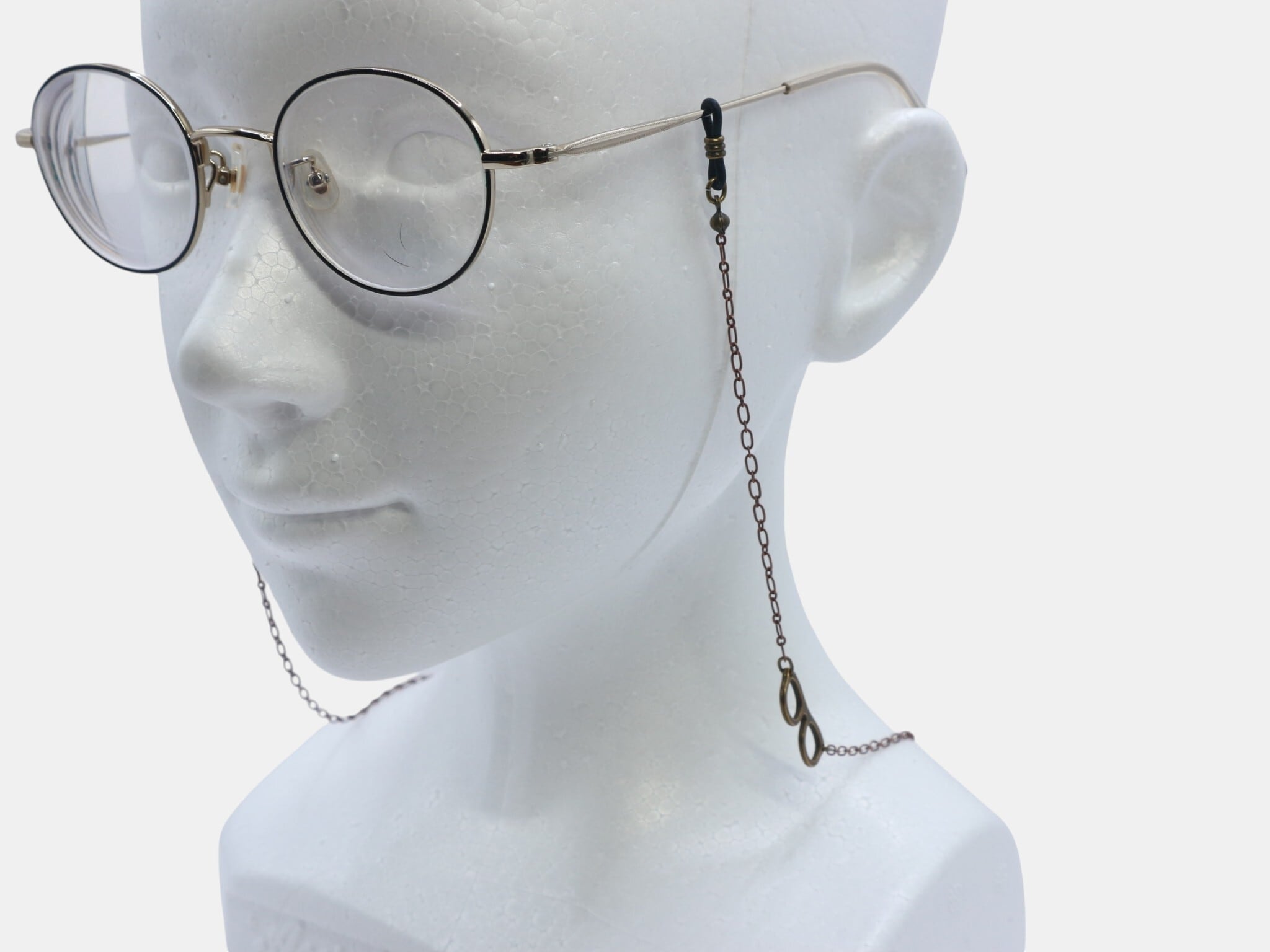 魅力的なデザインと高級感を合わせ持つ〈A700 メガネモチーフとアンティークチェーンのグラスコード〉。メタル製のメガネモチーフが独特の存在感を放ち、アンティーク色の金属チェーンが全体を優雅に引き立てます。デザインのコンビネーションが調和した洗練されたアイテムです。