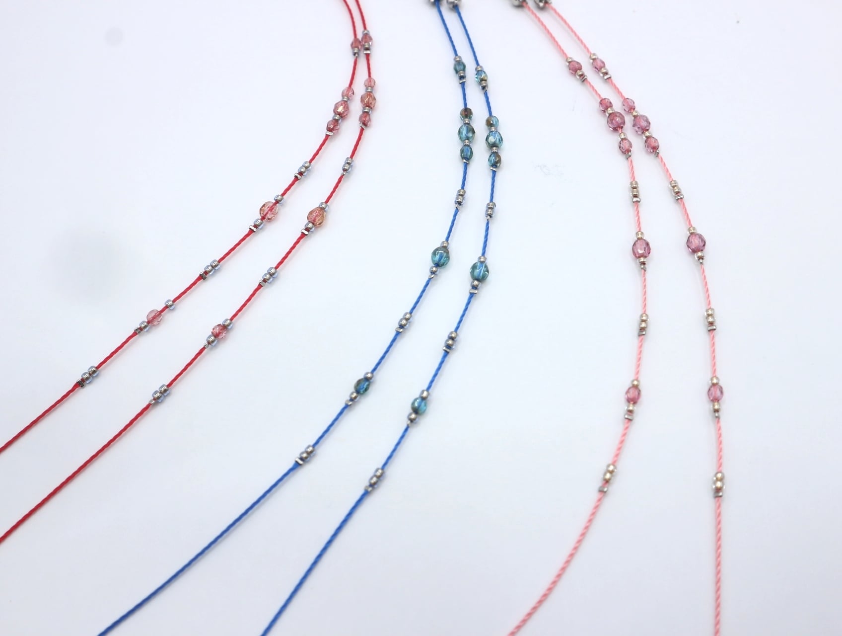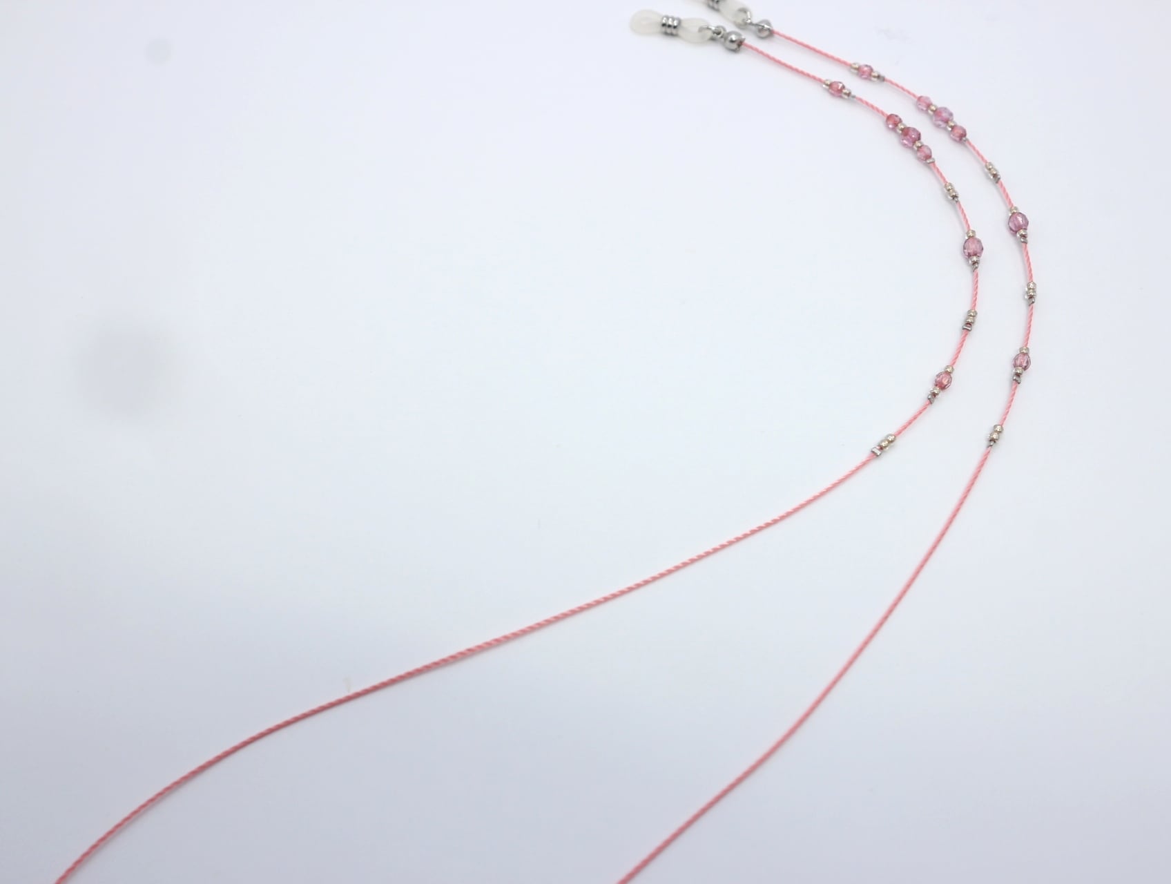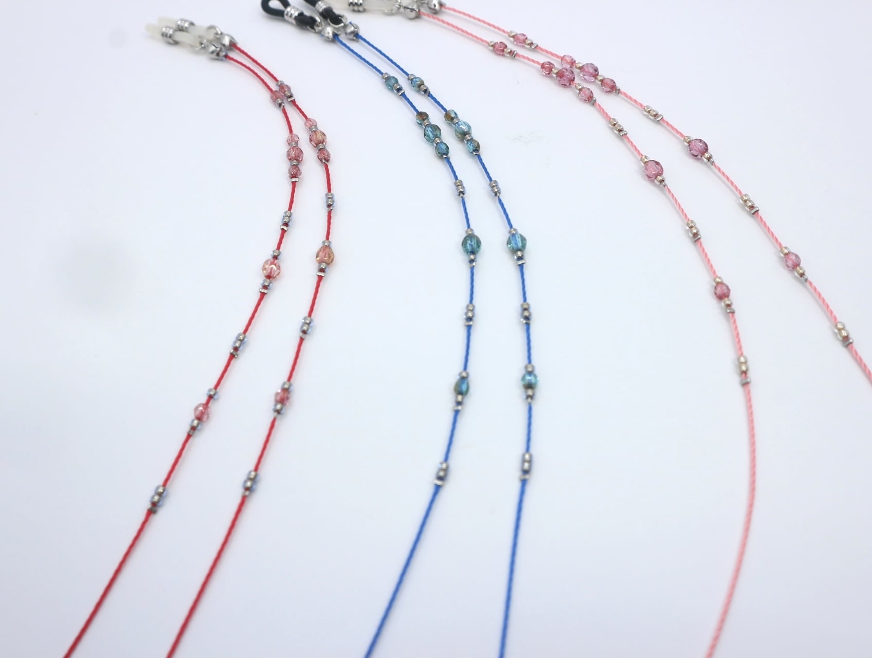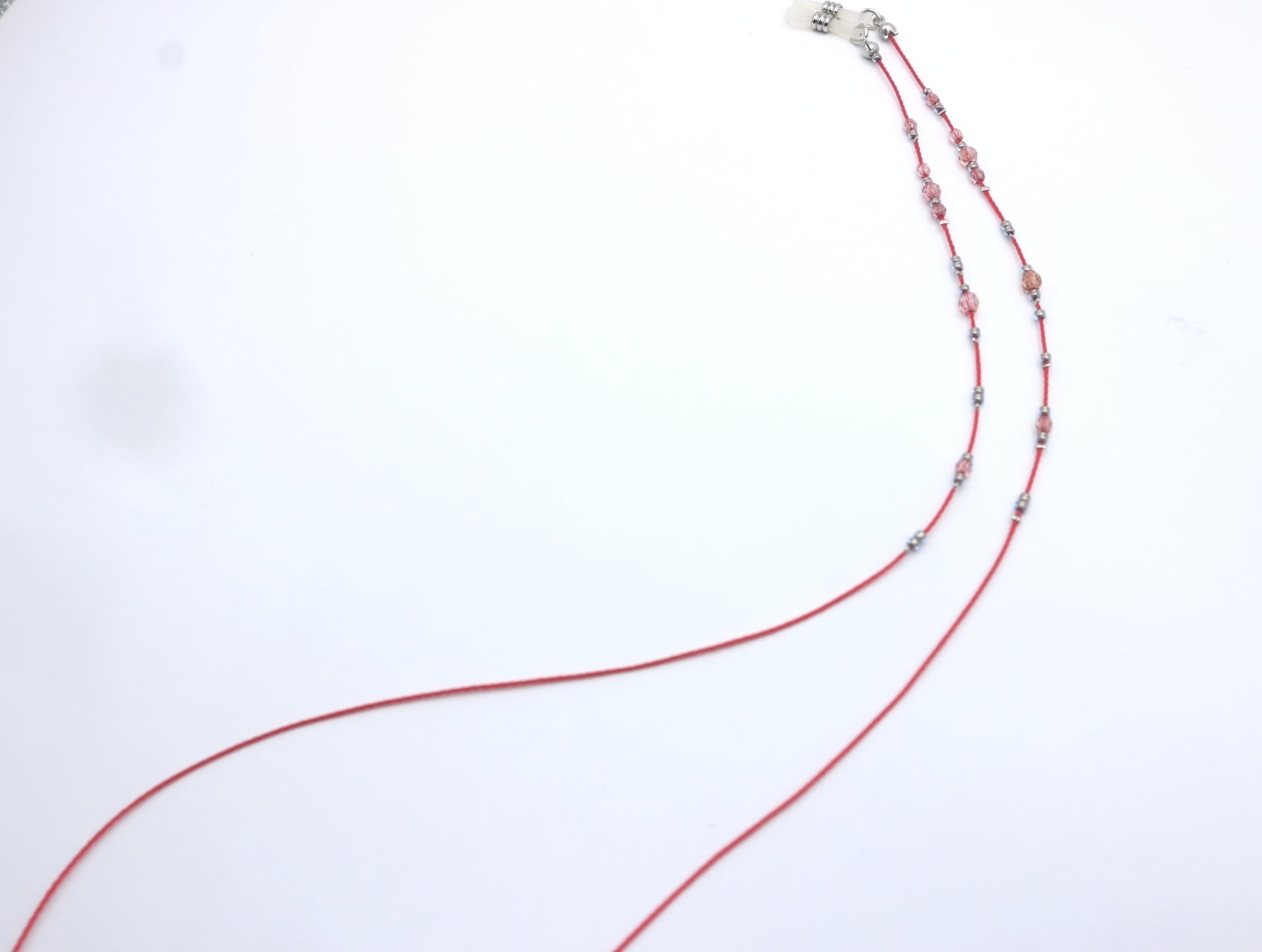 美しいチェコビーズが視線を引き付ける〈A489 チェコビーズ メガネコード〉。3ミリと4ミリの同色のチェコビーズに、細やかな小粒ビーズがアクセントとなり、全体のデザインを華やかに彩ります。コード自体もチェコビーズと同系色にこだわり、全体に統一感を持たせました。どんなスタイルにも合わせやすく、日常使いにぴったりなアイテムです。