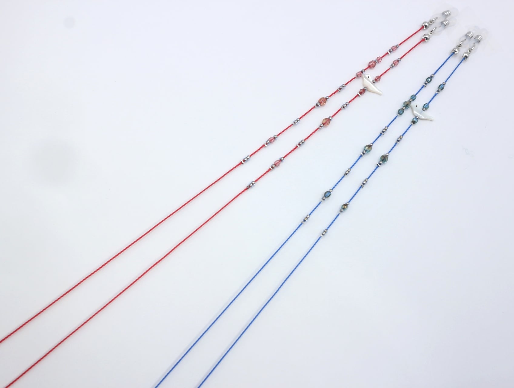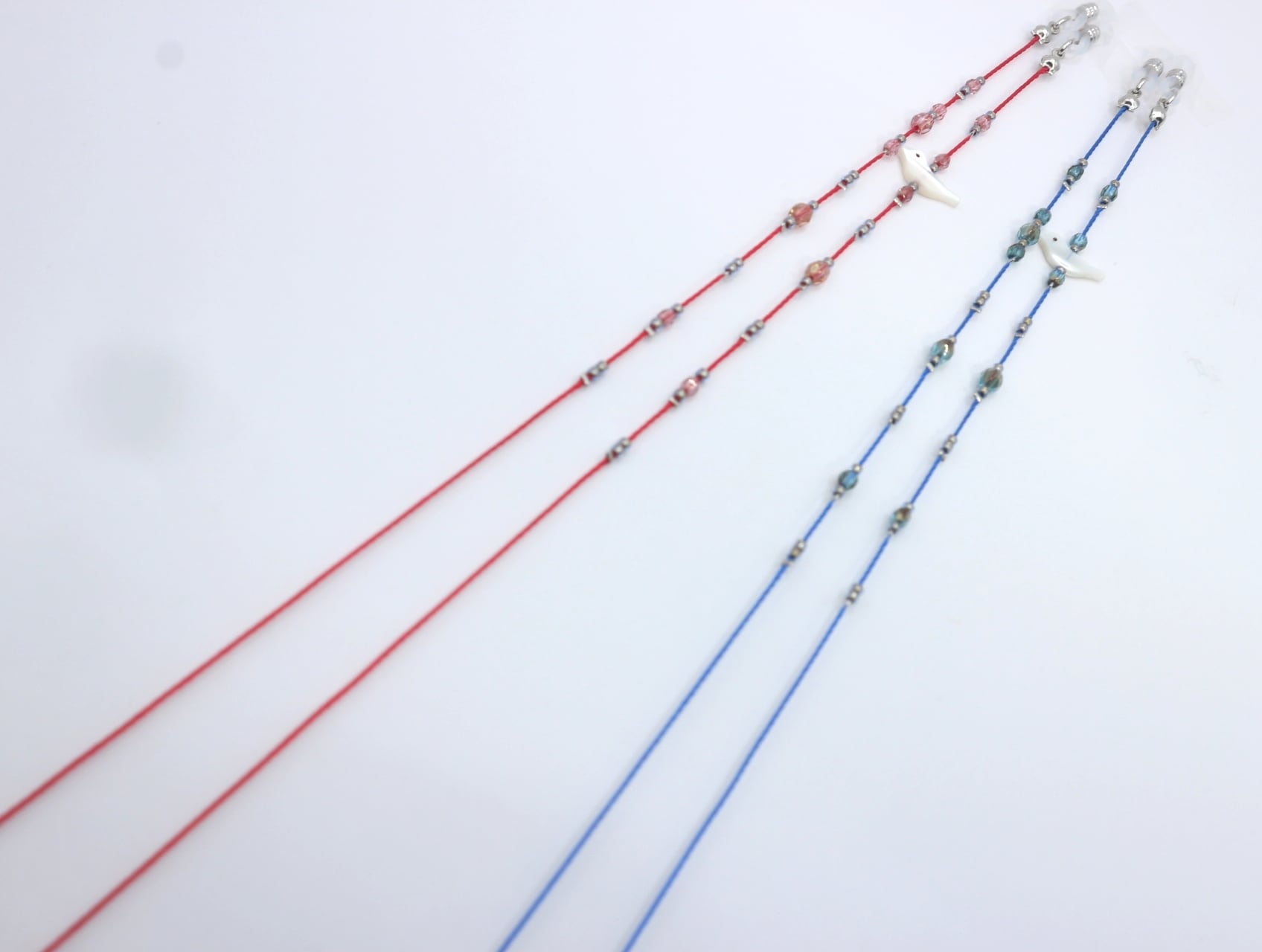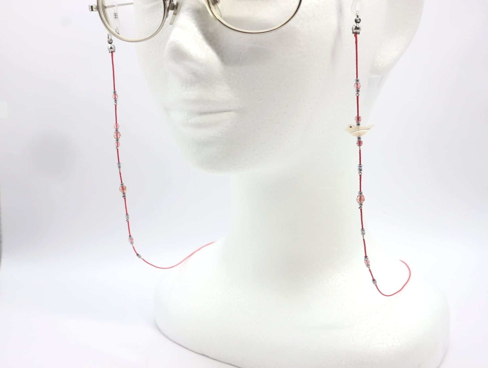 小鳥のシェルビーズとチェコビーズのグラスコード、A662。明るいカラーの紐と白い小鳥のシェルビーズがお顔周りに華やかさと可愛らしさをプラスして、よりアクセサリー感覚でお使いいただけるメガネコードです。