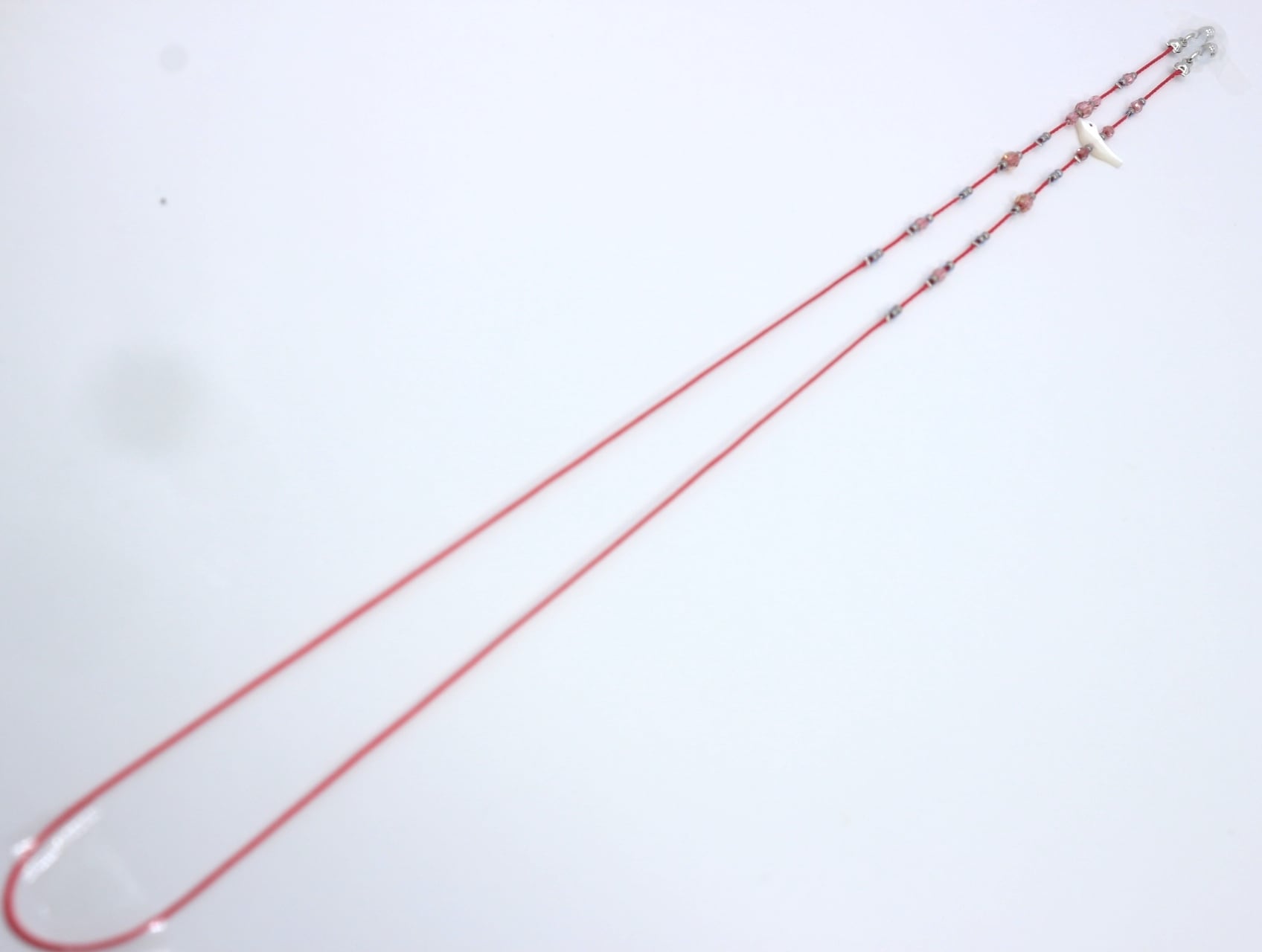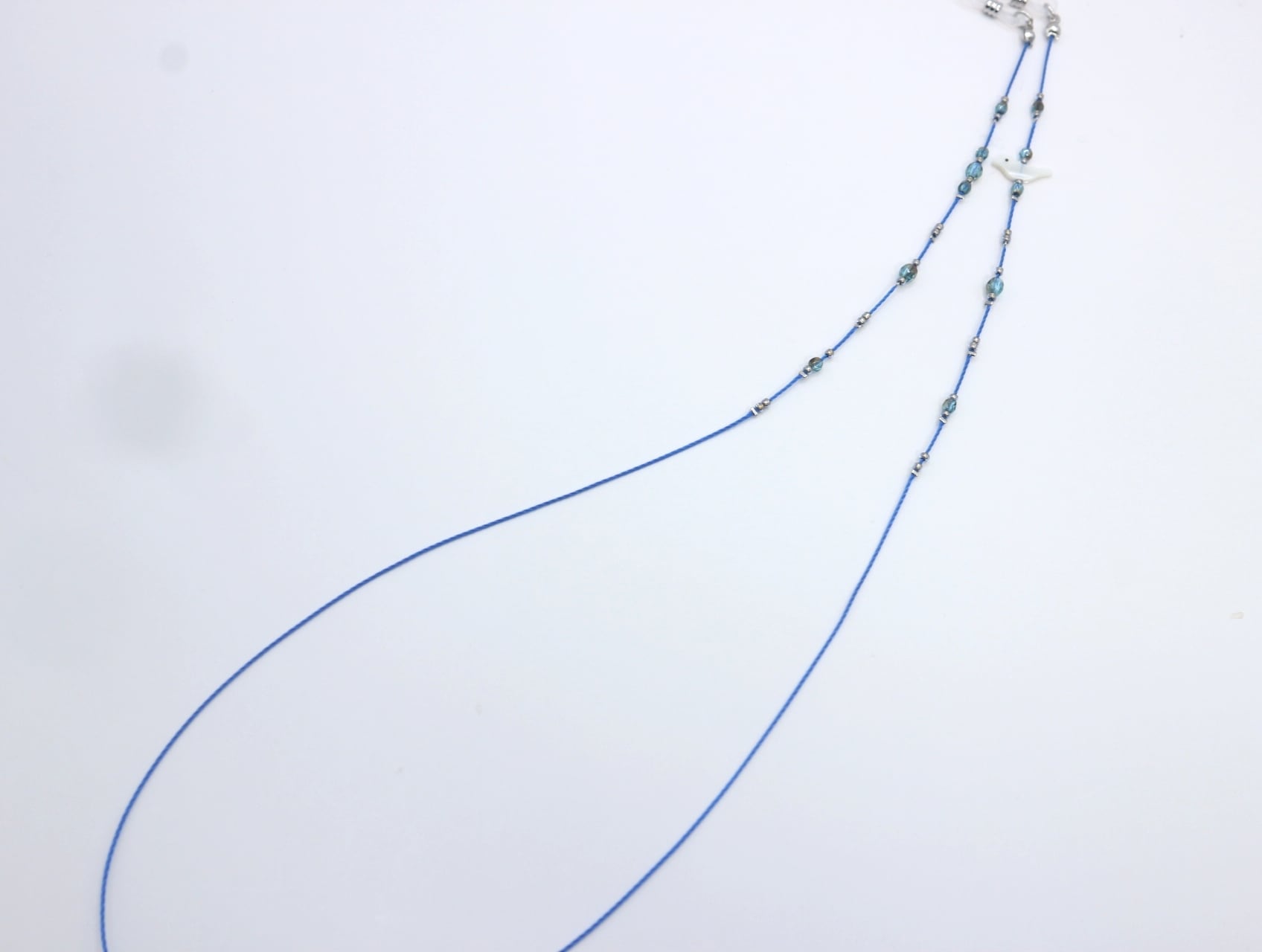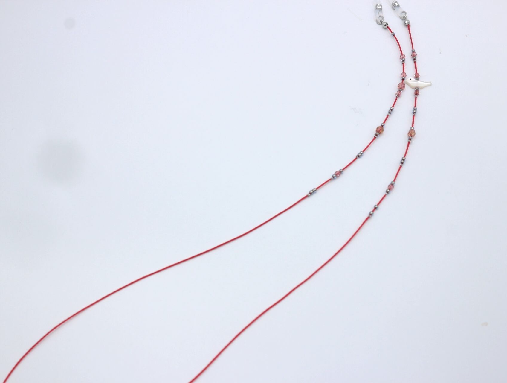 小鳥のシェルビーズとチェコビーズのグラスコード、A662。明るいカラーの紐と白い小鳥のシェルビーズがお顔周りに華やかさと可愛らしさをプラスして、よりアクセサリー感覚でお使いいただけるメガネコードです。