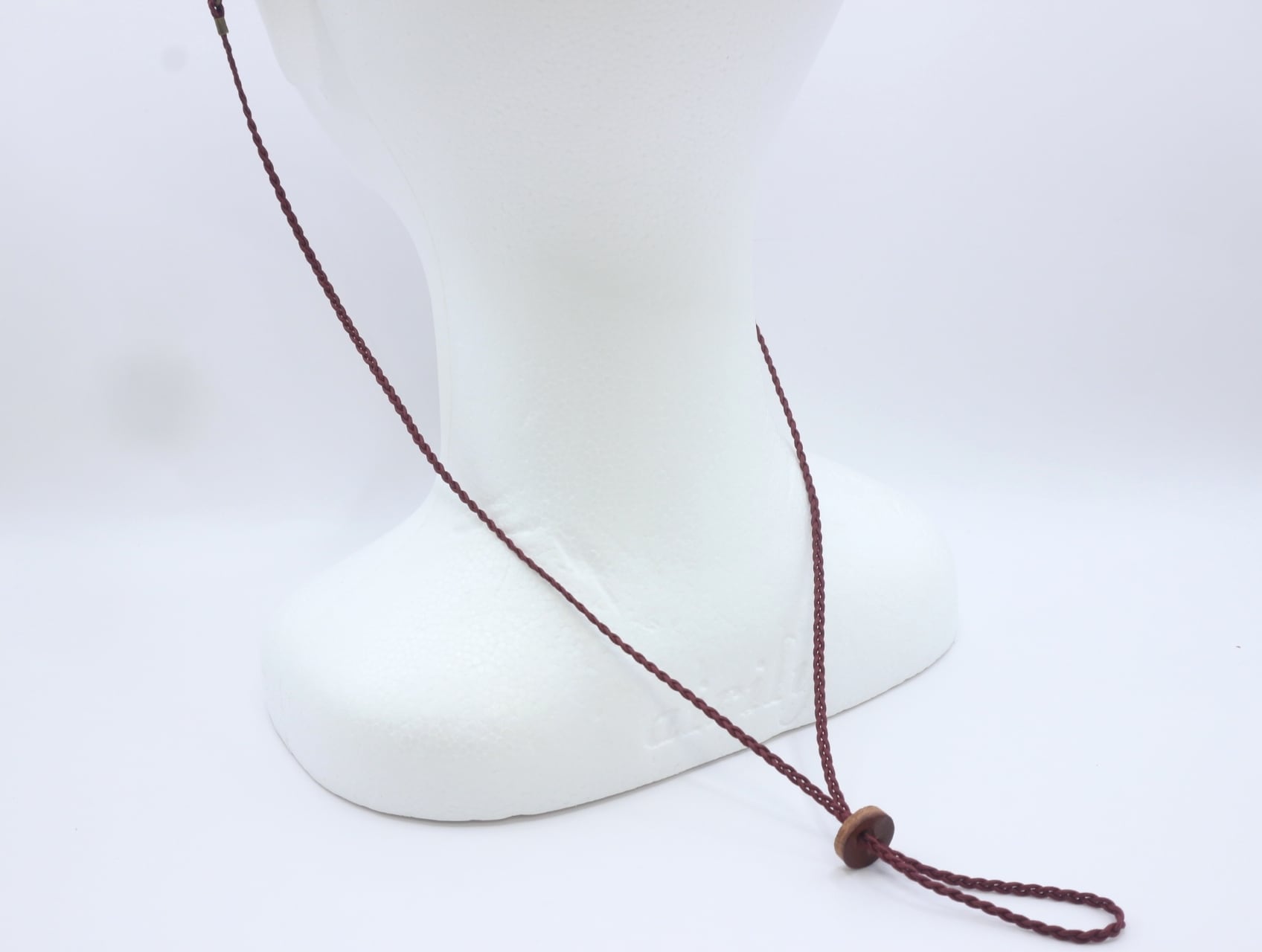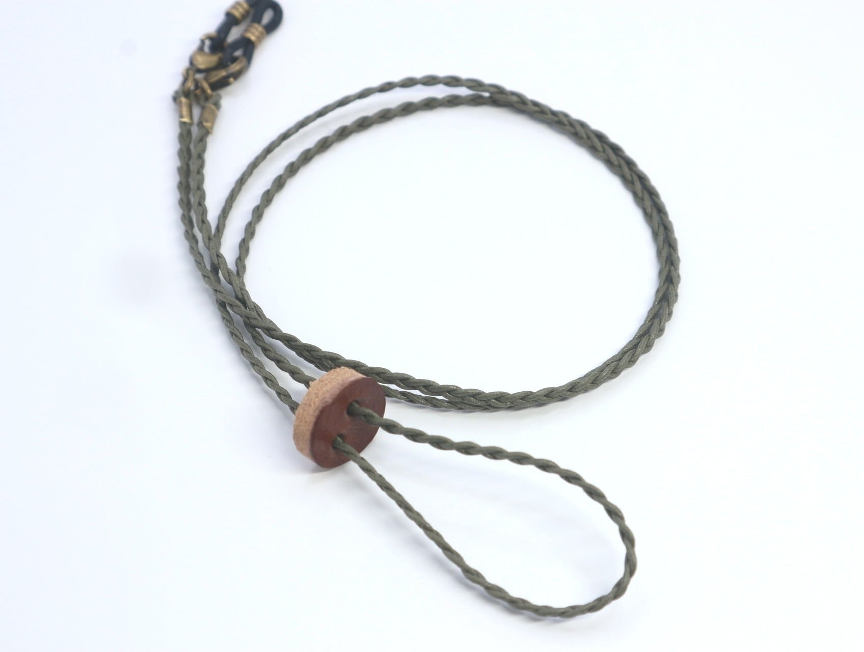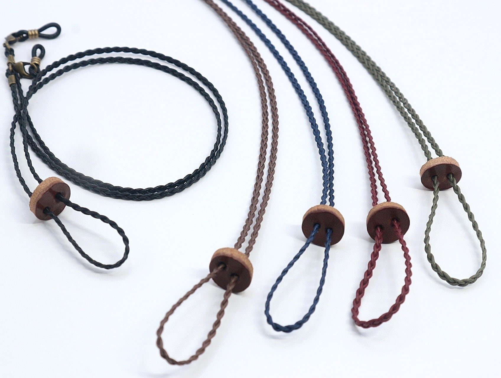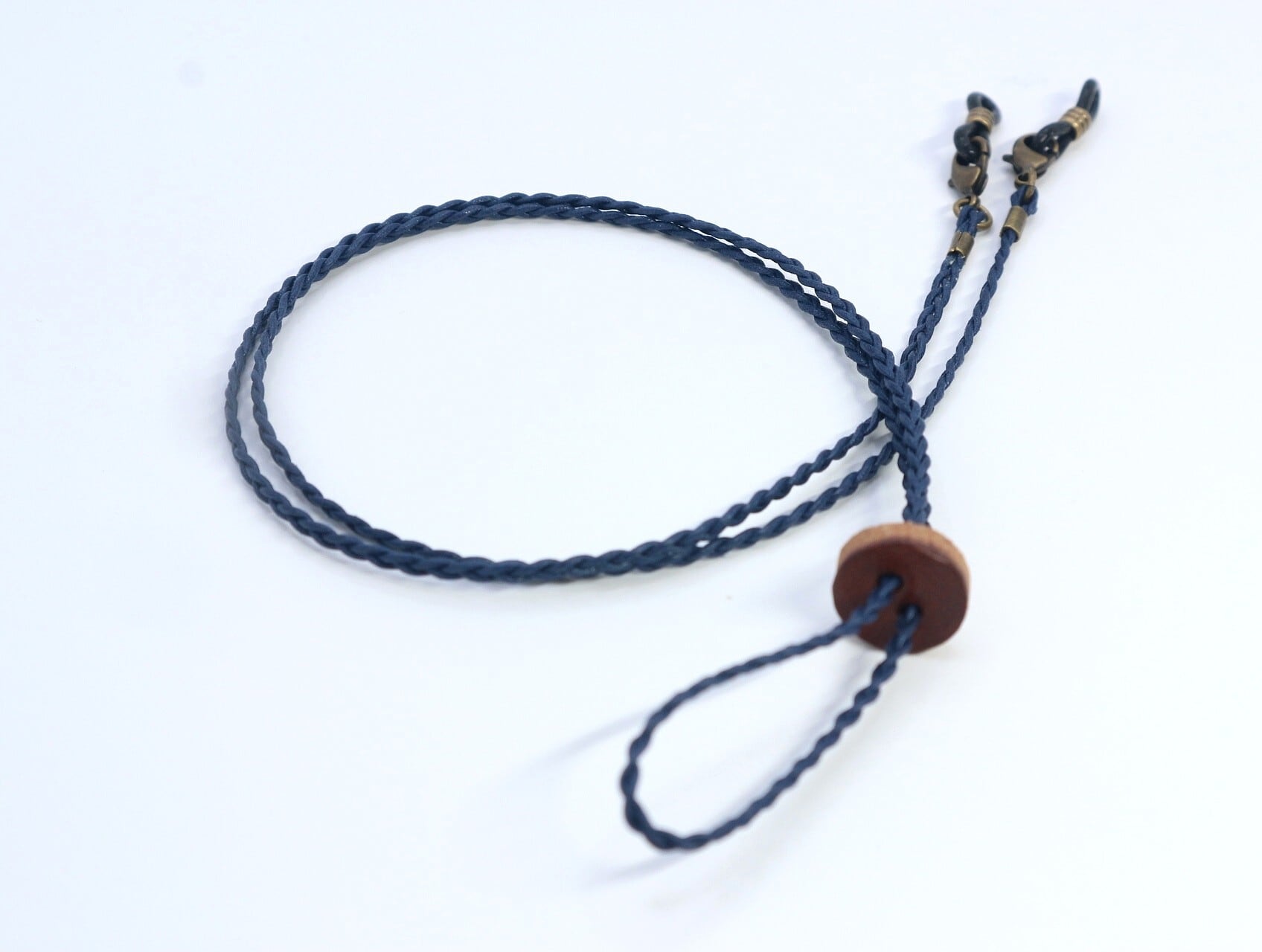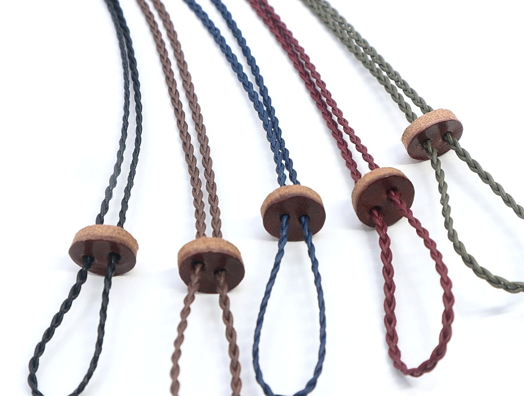 〈A701 合皮&革ボタン コードとホルダーの2WAY〉は、機能性とファッション性を兼ね備えたアイテムです。コットン製の3つ編みコードが、デイリーのコーディネートをおしゃれに引き立てます。革ボタンで長さ調整が可能、使うシーンやお好みに応じて最適な長さに調整できます。