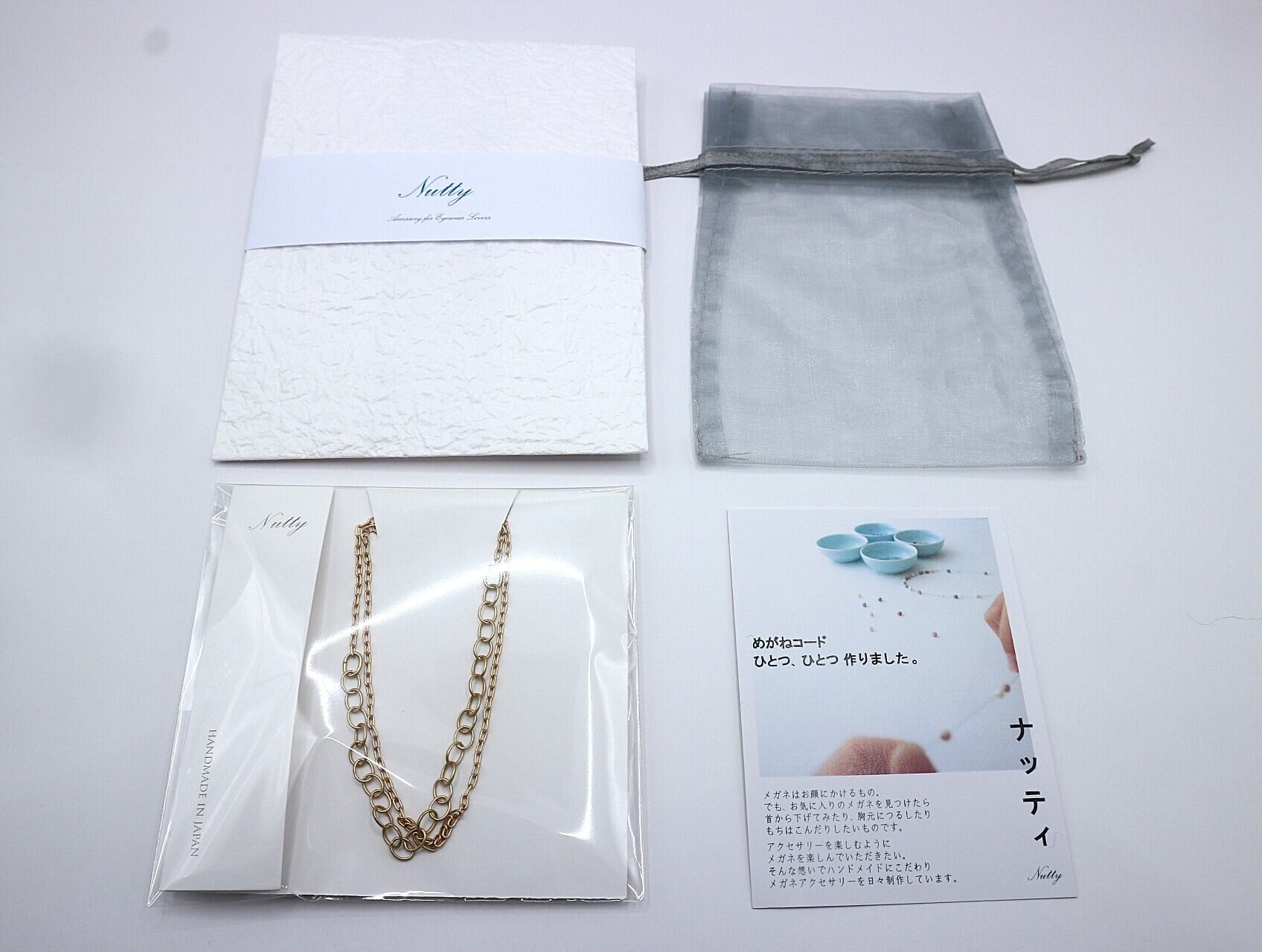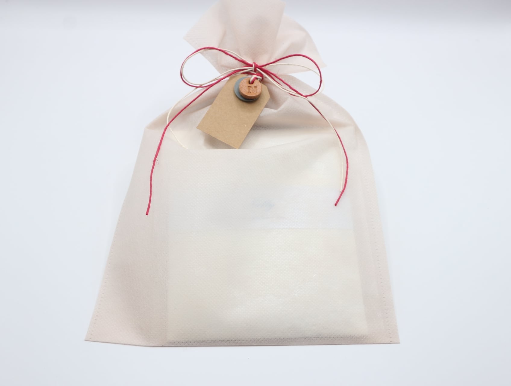 〈プレゼント用ラッピング〉ご用意いたしております。 2枚目写真ご参照ください。 商品と巾着を左上の和紙にお包みして、右下のブランドカードとあわせてラッピングバッグにお入れします。 ラッピングバッグはベージュ色の不織布を使用。紅白の紐と革ボタンで結びます。 サイズは約17CM x 26CM。