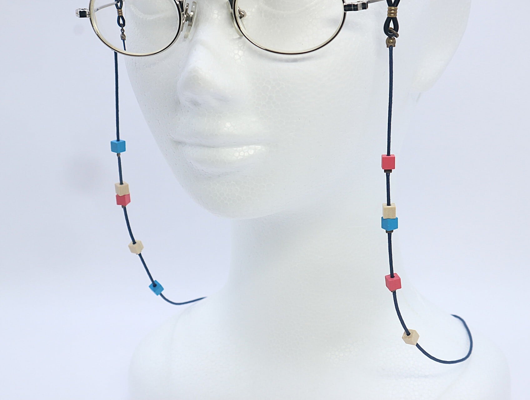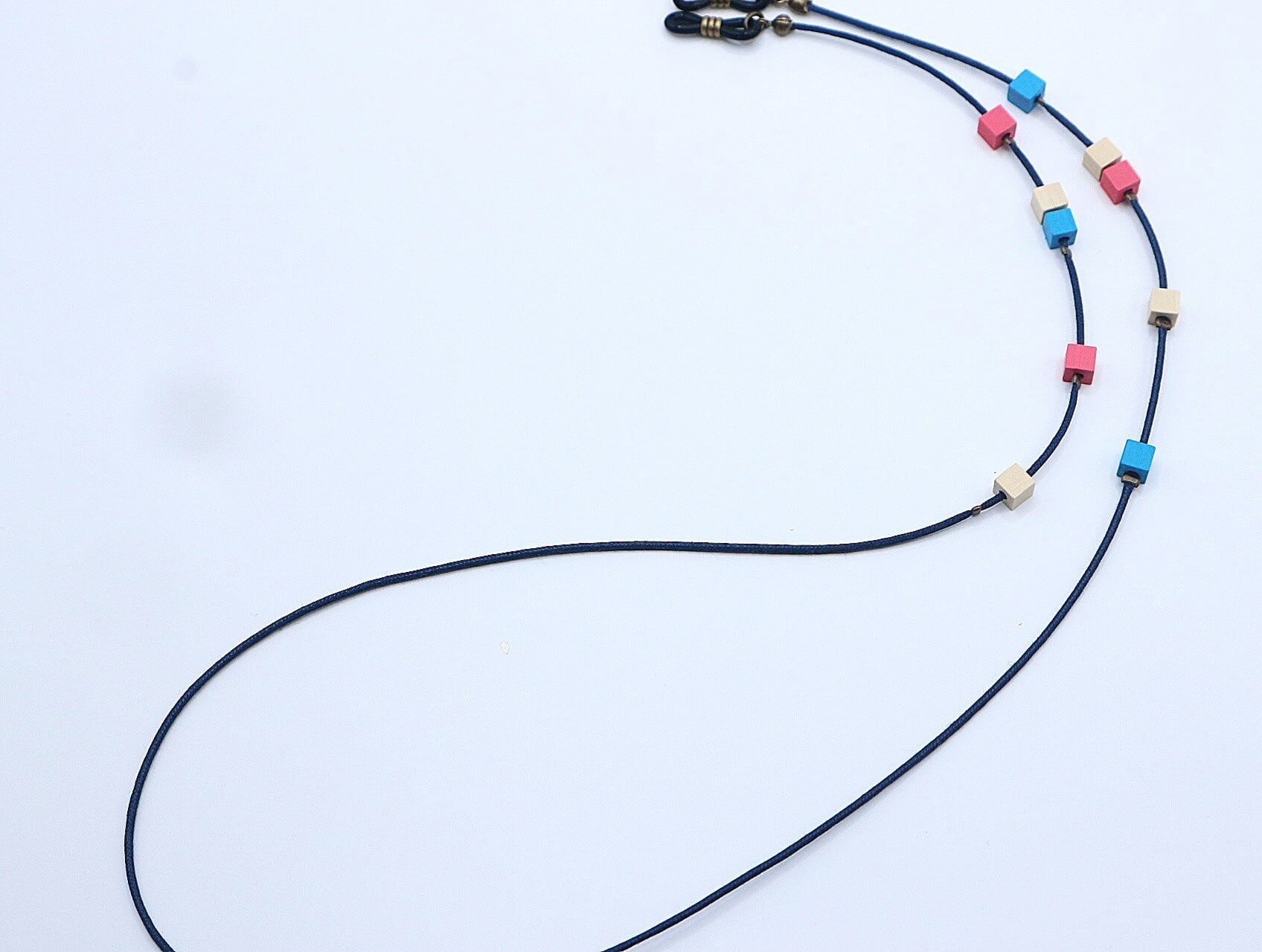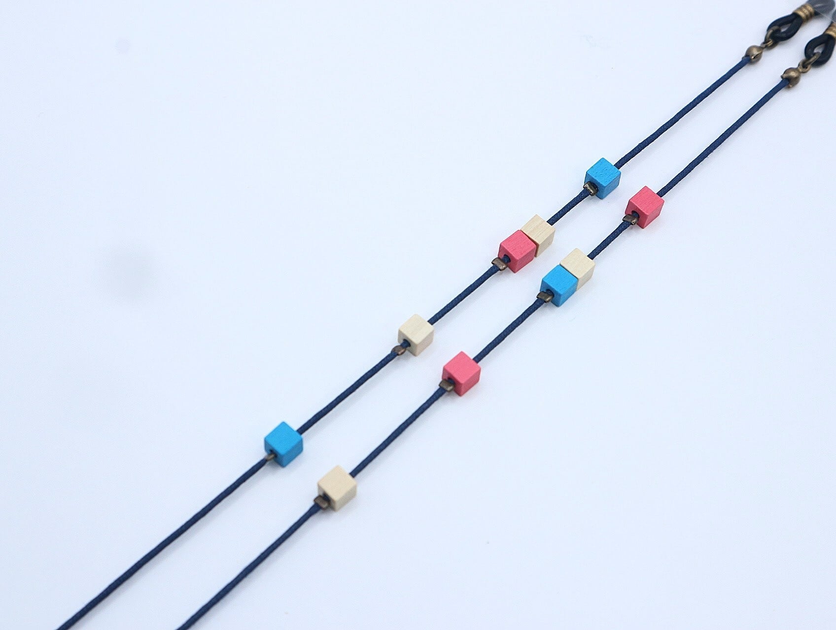 自然な風合いが魅力の〈A354 ウッドキューブ メガネコード〉。コットンの紐とチェコ製のウッドビーズを使用し、天然素材の温もりを感じさせるデザインが特徴です。ウッドビーズの配色にもこだわり、シンプルながらもおしゃれな印象を与えます。ファッションの一部として、さりげなくスタイルを引き立てるアイテムとしておすすめです。