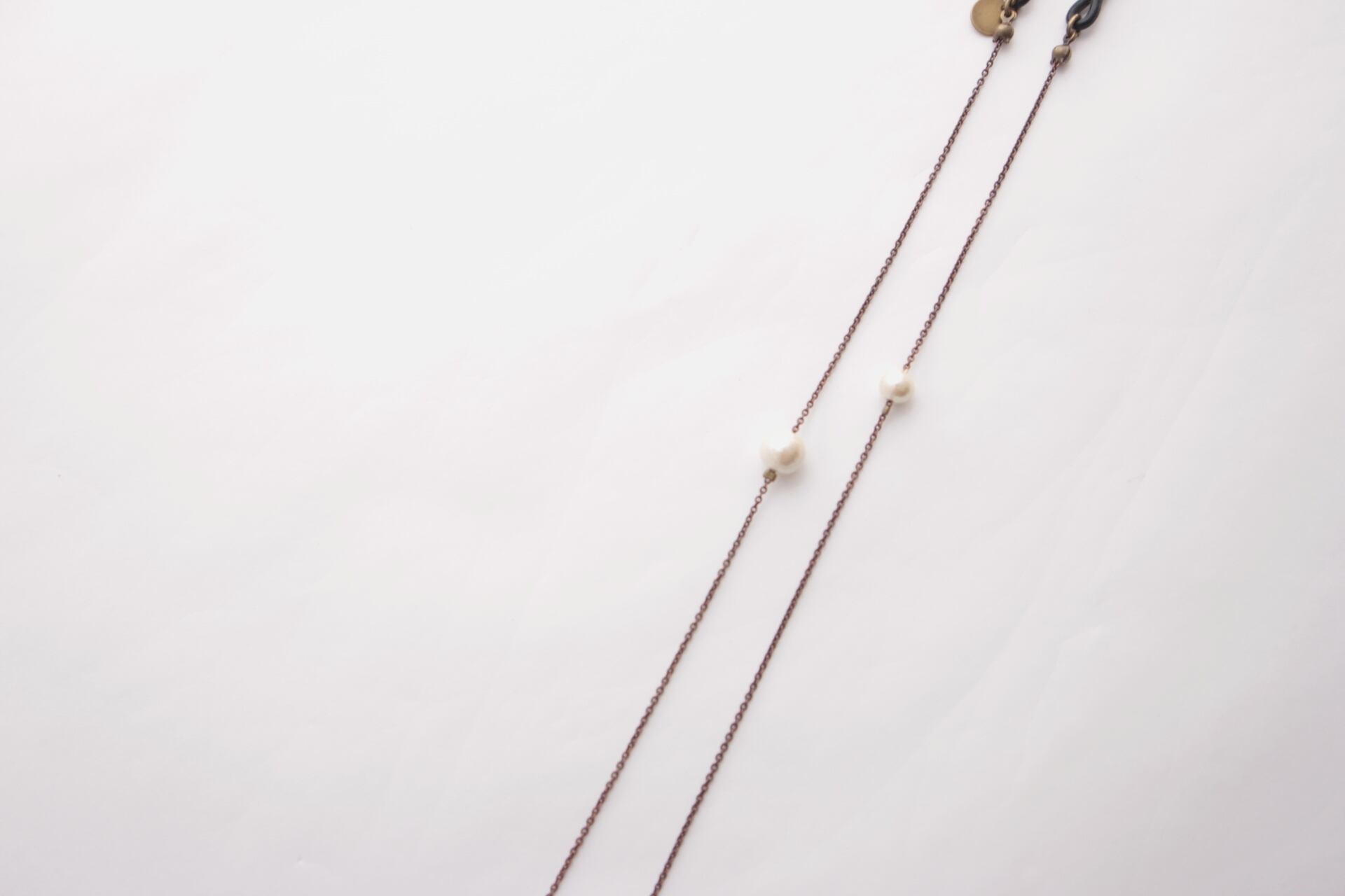 細めのチェーンとコットンパールがかわいいチェーンコードです。アンティークなお色のチェーンとクリーム色のコットンパールの組合せ。大小のコットンパールは左右で高さの位置を変え、アンバランスさが魅力です
