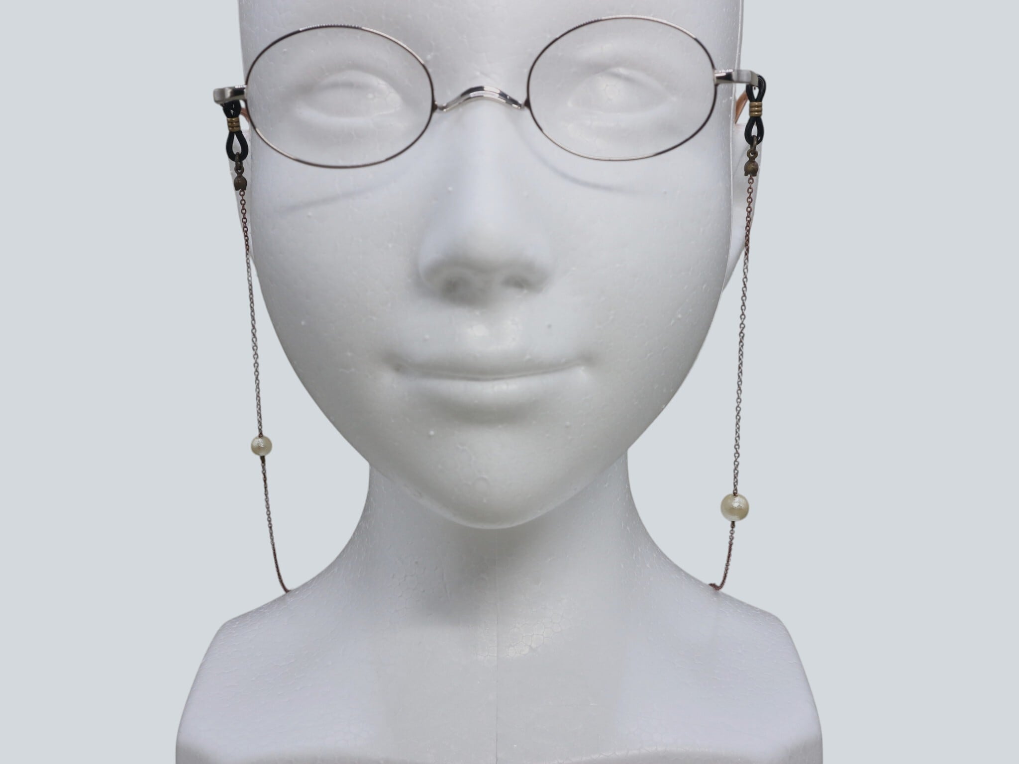 薄いクリーム色のコットンパールに、細めのアンティークカラーのチェーンが絶妙なバランスで組み合わせた〈A453 コットンパール メガネチェーン〉。8ミリ&6ミリの大きさの異なるコットンパールが左右に配置され、また、左右の高さを変えることで生まれるアンバランスさも魅力の一つです。