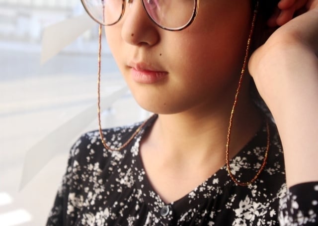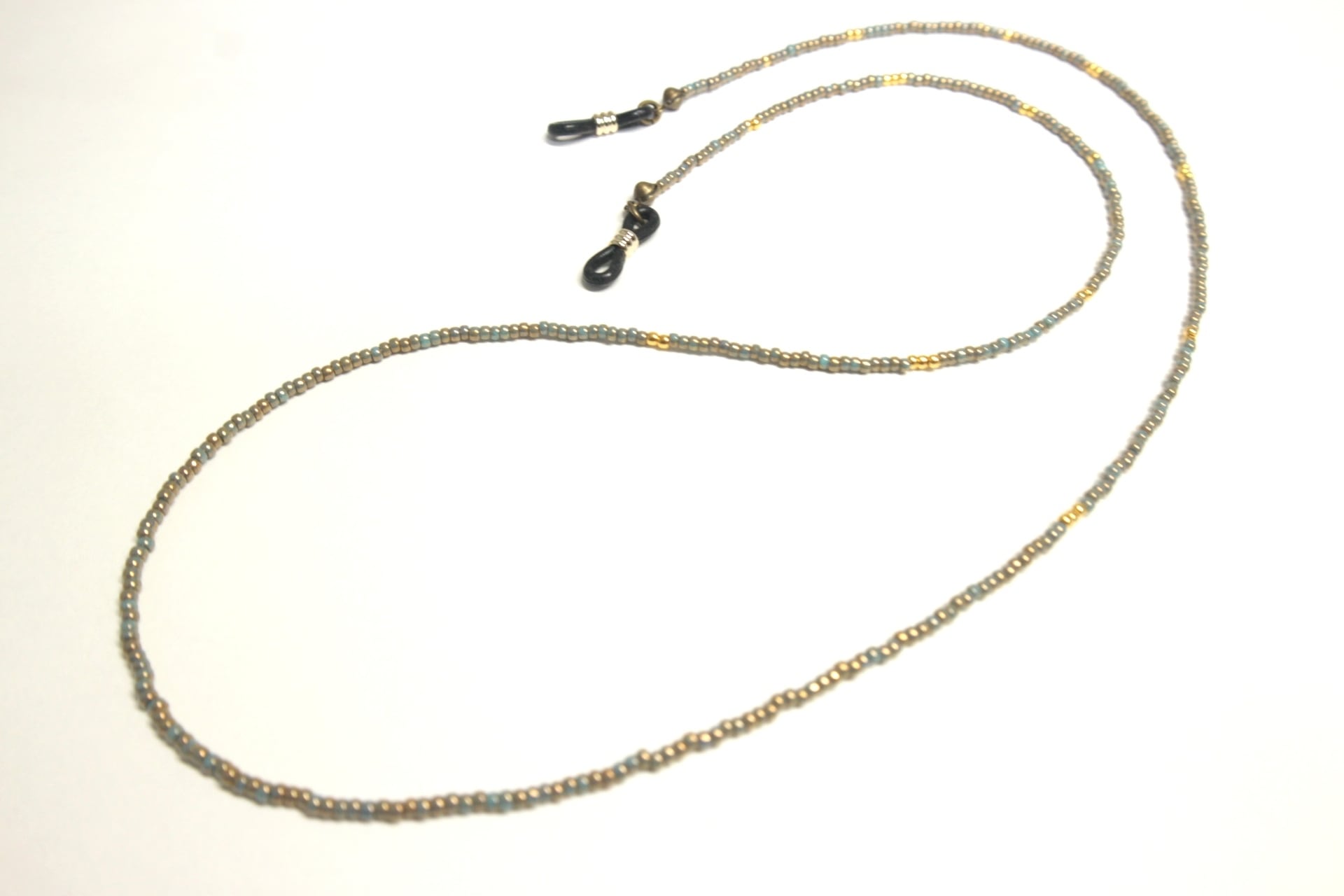 蒔絵と同じ手法で本金をあしらったプラスチック製の粒ビーズを使った 細く繊細なグラスコード。写真で金色にみえる部分以外のビーズ(それぞれパープル、ブラウン、ブルーの粒ビーズ)にも本金加工がされています。