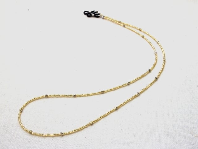 A607と同じように六角ビーズとチェコビーズのコンビネーションのグラスコードです。こちらはゴールド、シルバー(クリア)と軽やかな感じのカラーを2色揃えました。