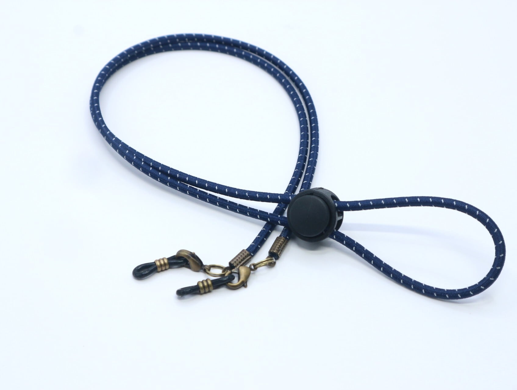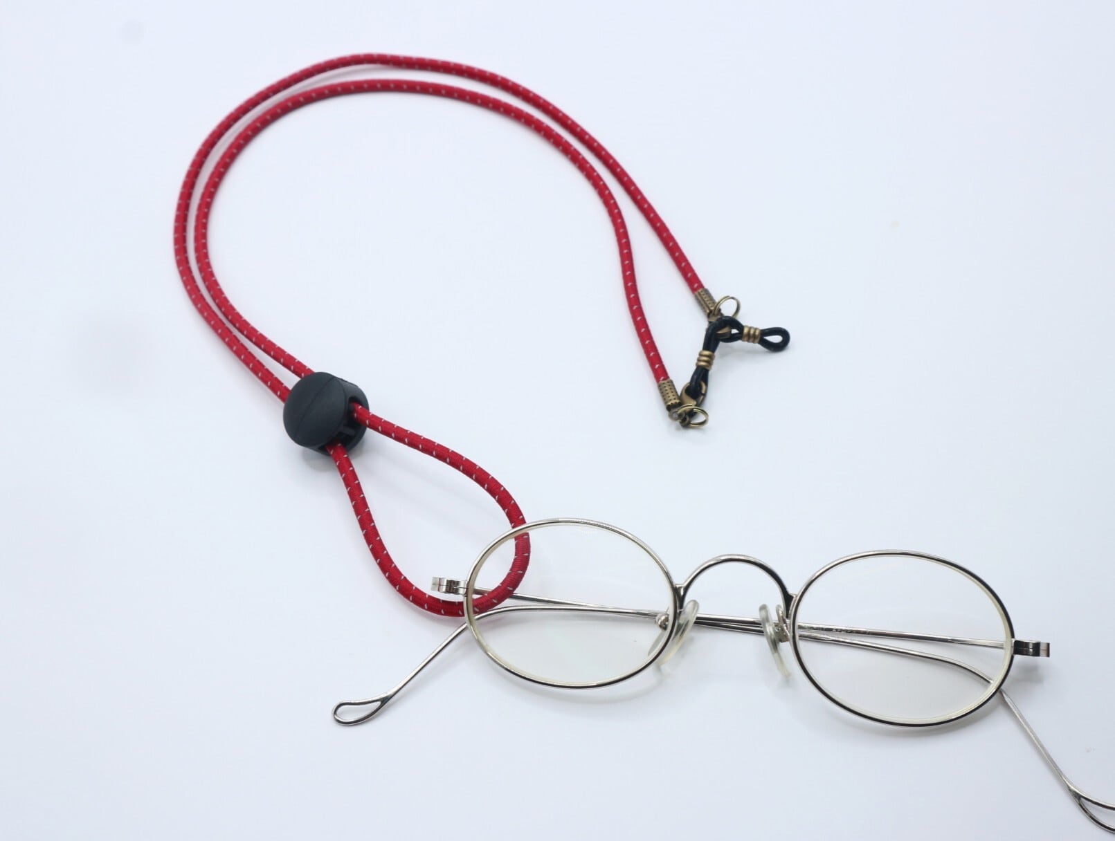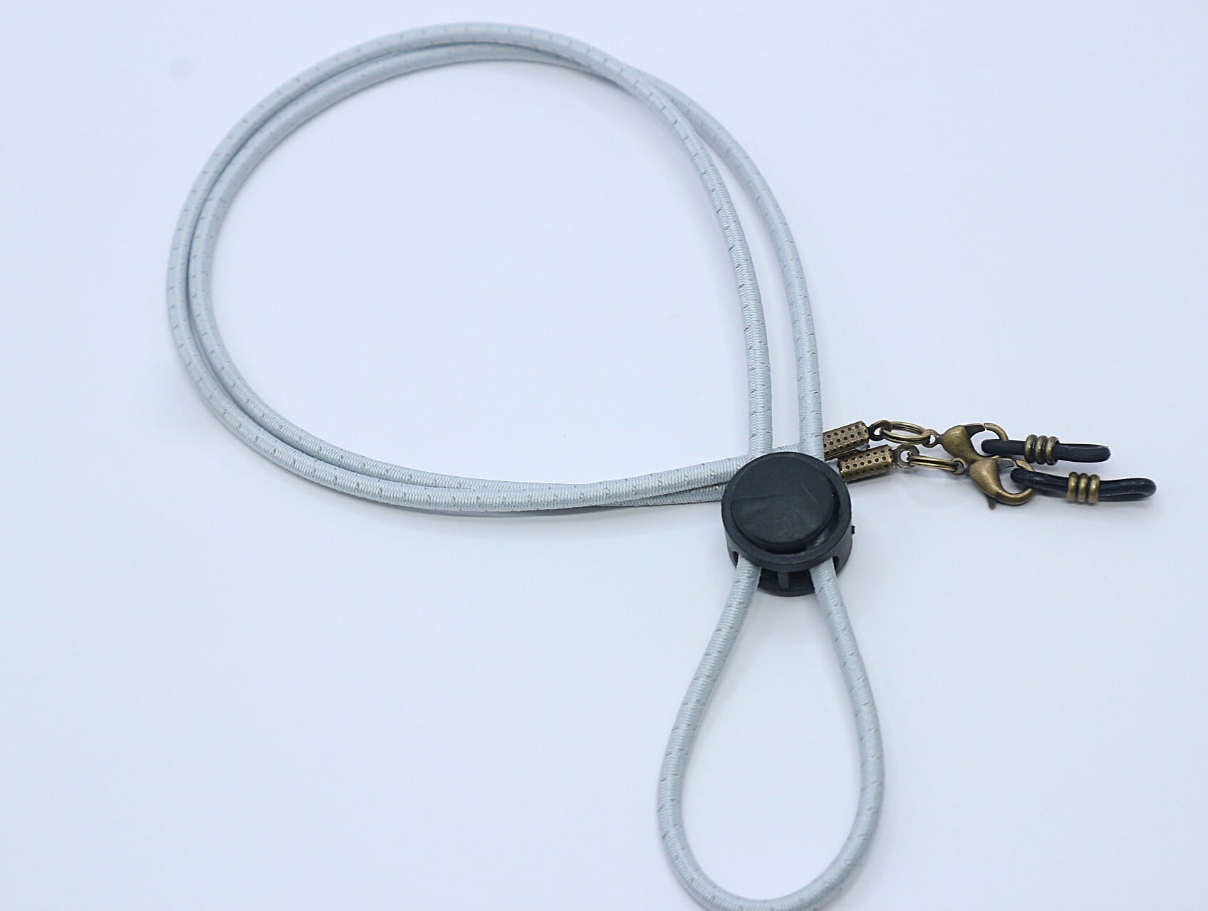 ストレッチ性のある約3ミリ幅の丸紐を使用した〈A622 再帰反射&ストレッチの2WAY メガネコード〉。特徴的な再帰反射性により、暗い場所でも光を当てることでしっかりと反射します。真ん中のアジャスターは長さの調整も可能で、お好みに合わせて自由に長さをアレンジできます。