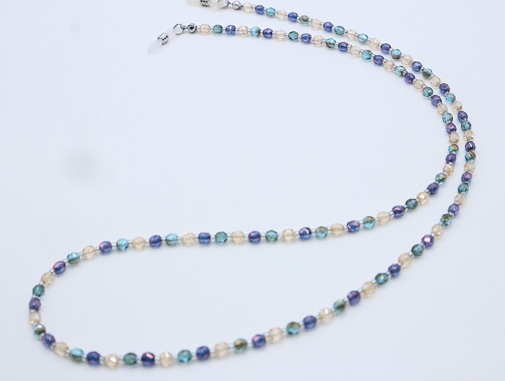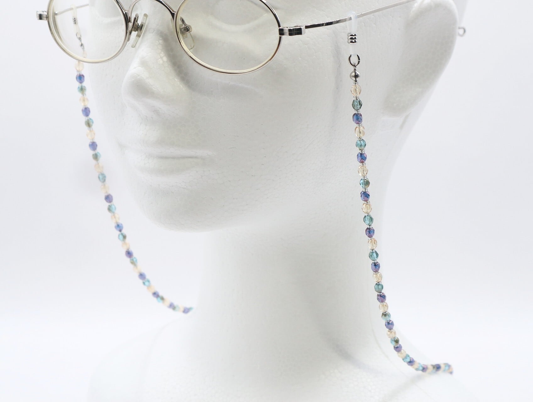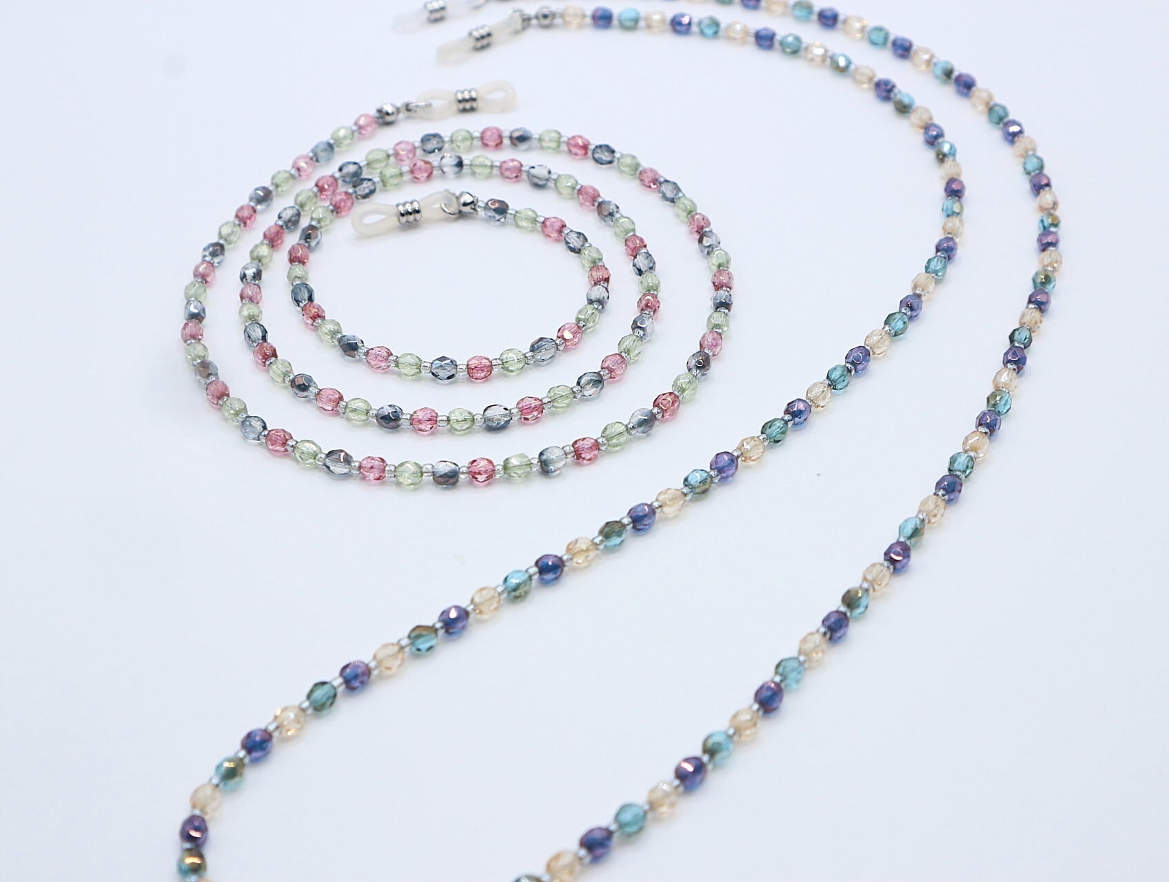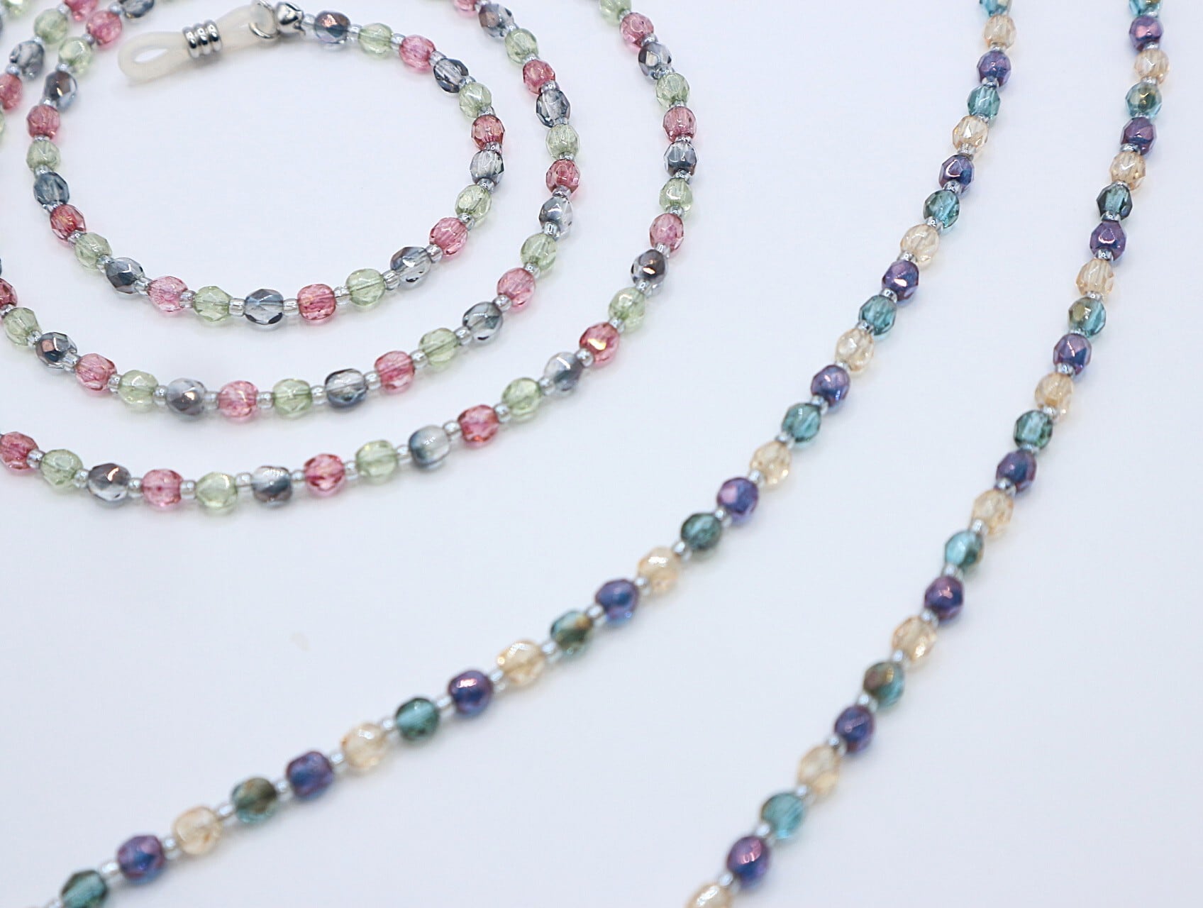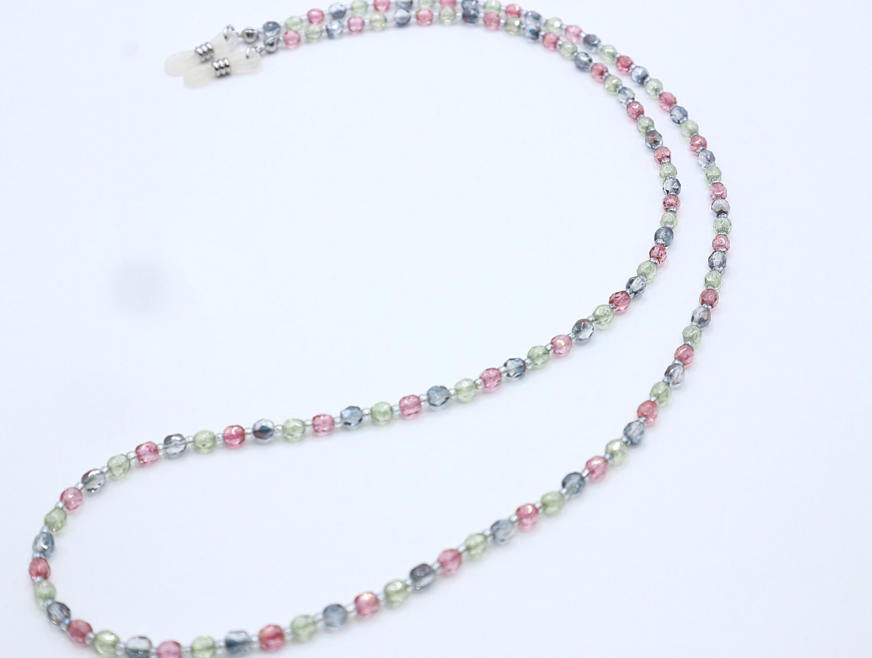 シンプルでありながらも華やかさをプラスする〈A507 チェコビーズ 3カラーミックス グラスコード〉。直径4MMのクリアカラーのチェコビーズ3色をバランス良く並べ、透明感のある明るい色から少し落ち着いた雰囲気の色まで、多彩な表情を楽しめるメガネコードにいたしました。