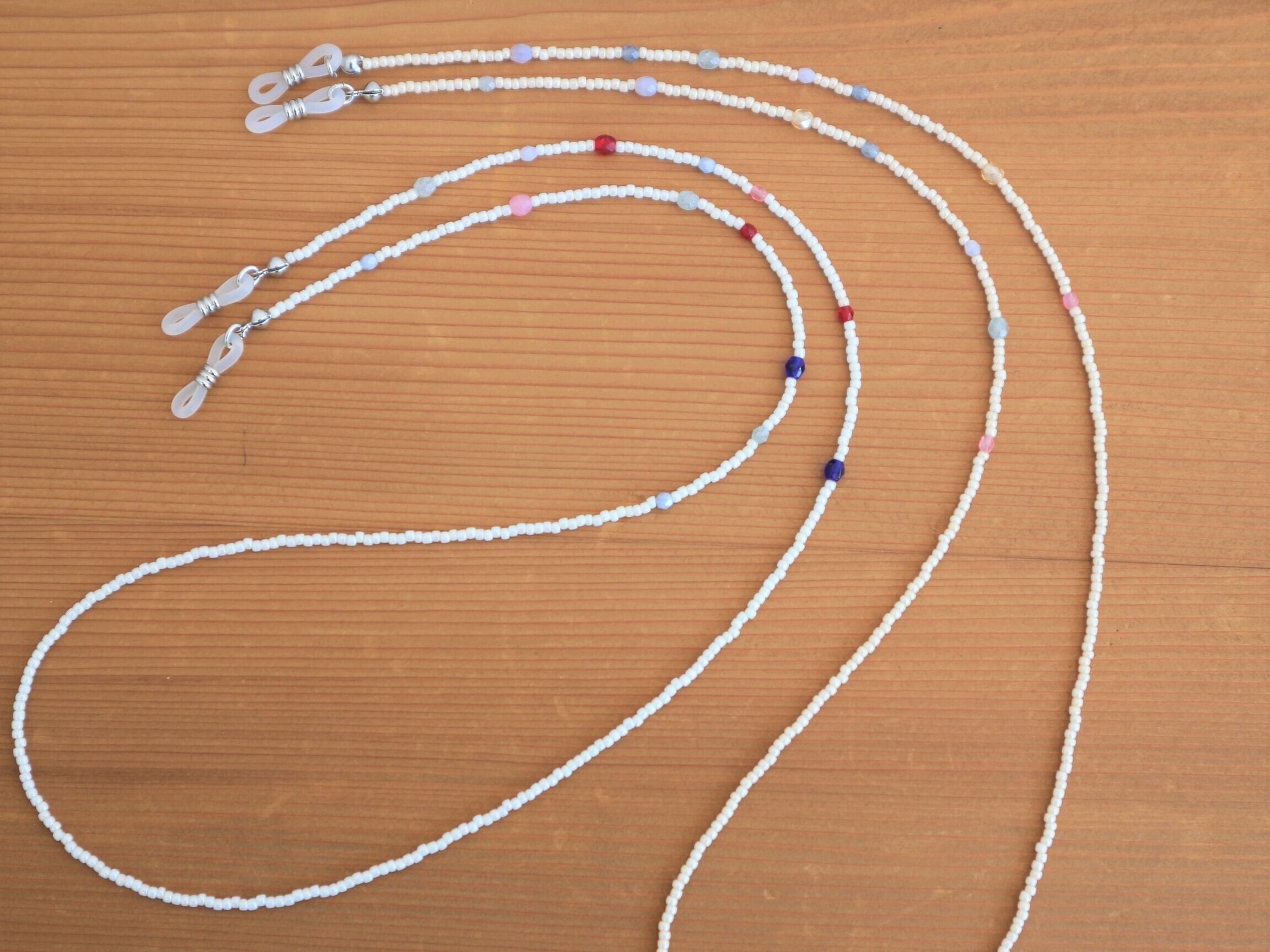 ホワイトカラーには赤やブルーなどの濃い色のビーズを加えることでより明るく華やかに、ベージュカラーはすべてパステル系のビーズでまとめて よりフェミニンなグラスコードに致しました。