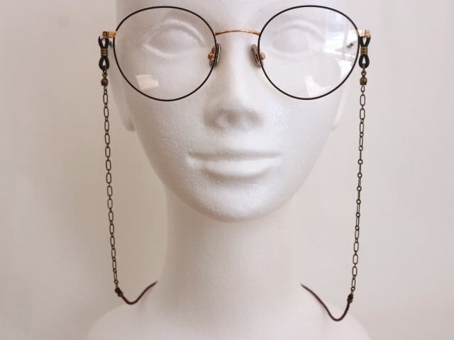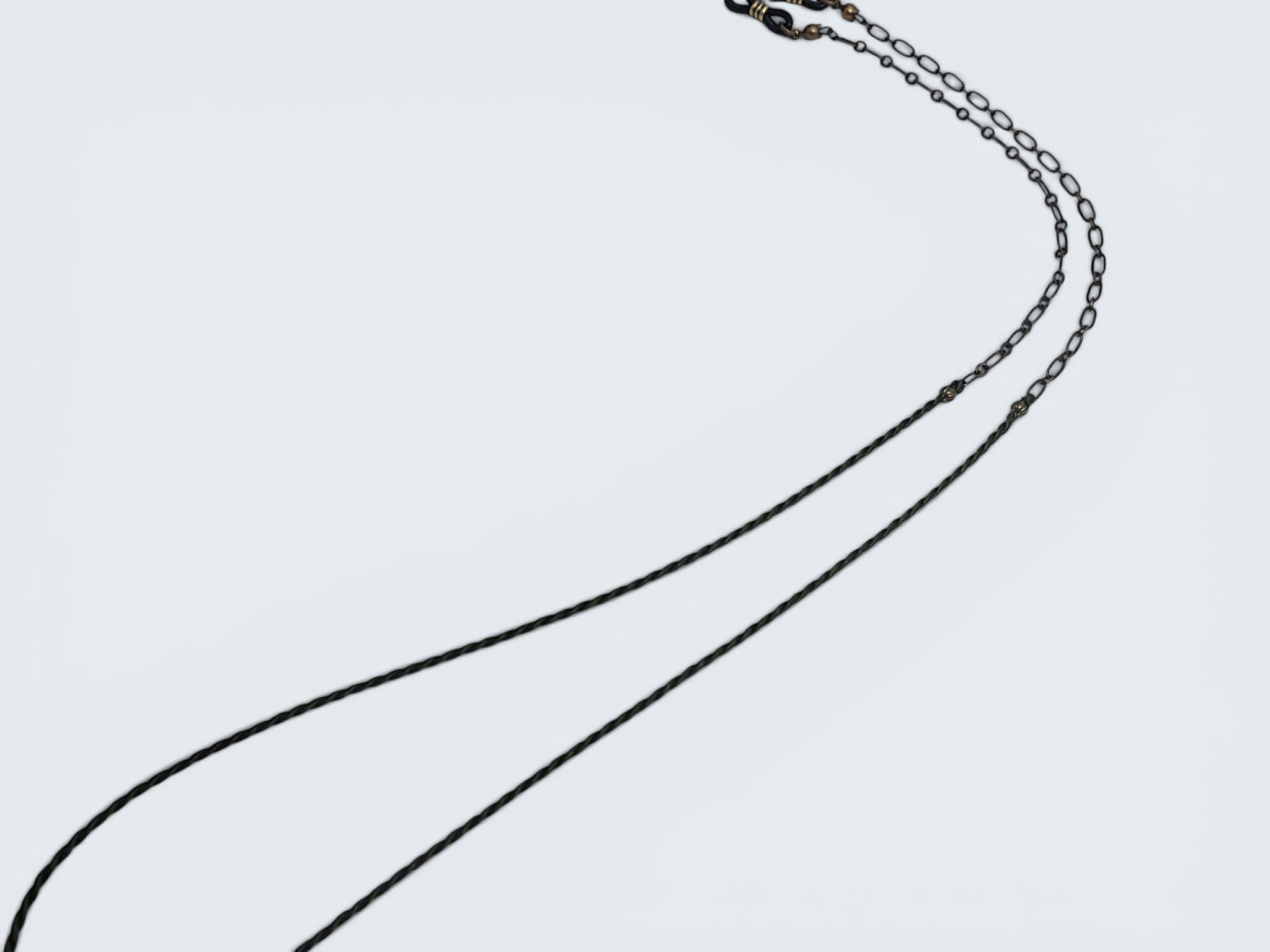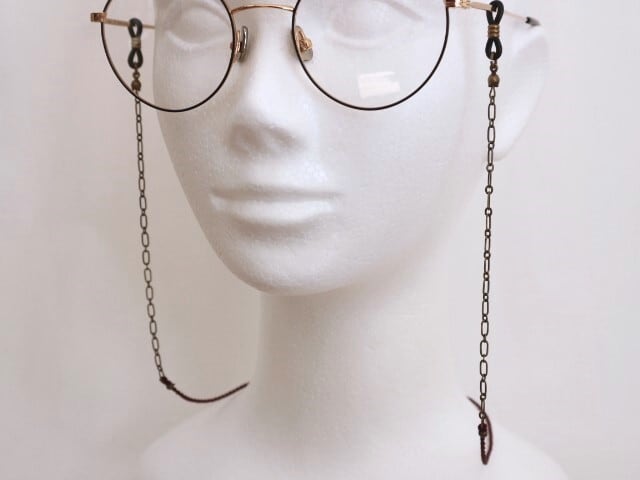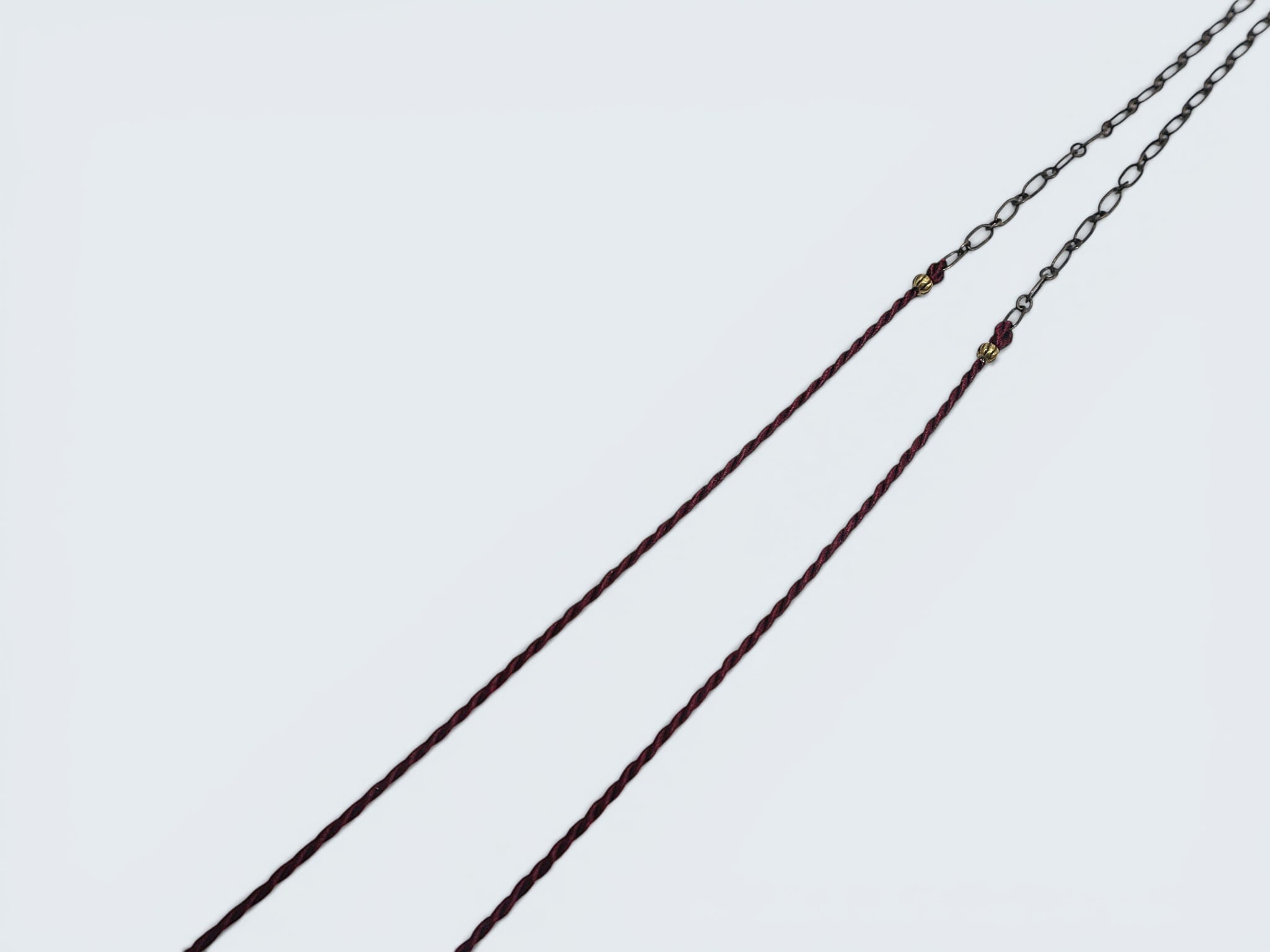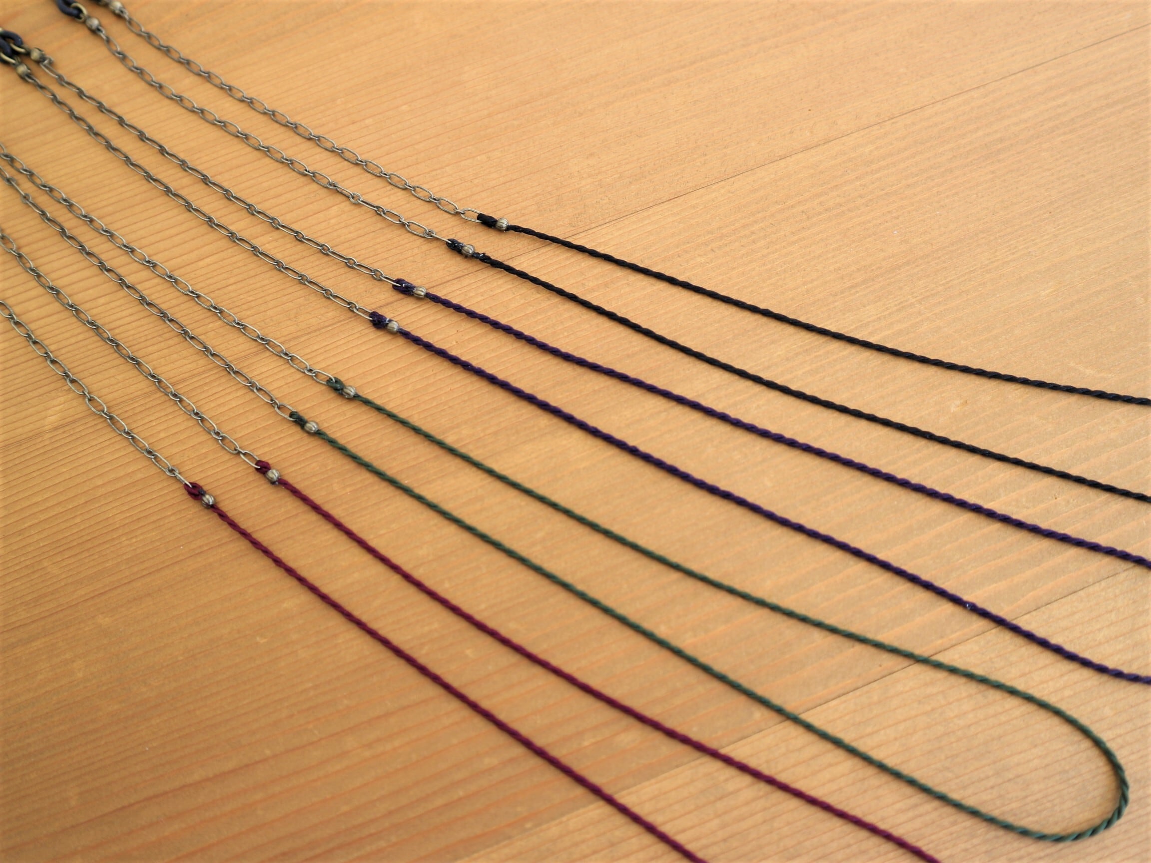 カラーは写真左から レッド グリーン パープル ブラック 日本製のシルク紐を3本ツイストしたコードとメタルチェーンの組み合わせ。 高級な光沢と優しい肌触りが特徴のシルクコード、1コマの横幅が6ミリとやや大きめながらも繊細かつ存在感のあるチェーン。上品で落ち着いた雰囲気のグラスコードです。 素材 シルク100% 丹銅製チェーン 長さ 全長約66CM シルク部分約41CM シルク幅2ミリ
