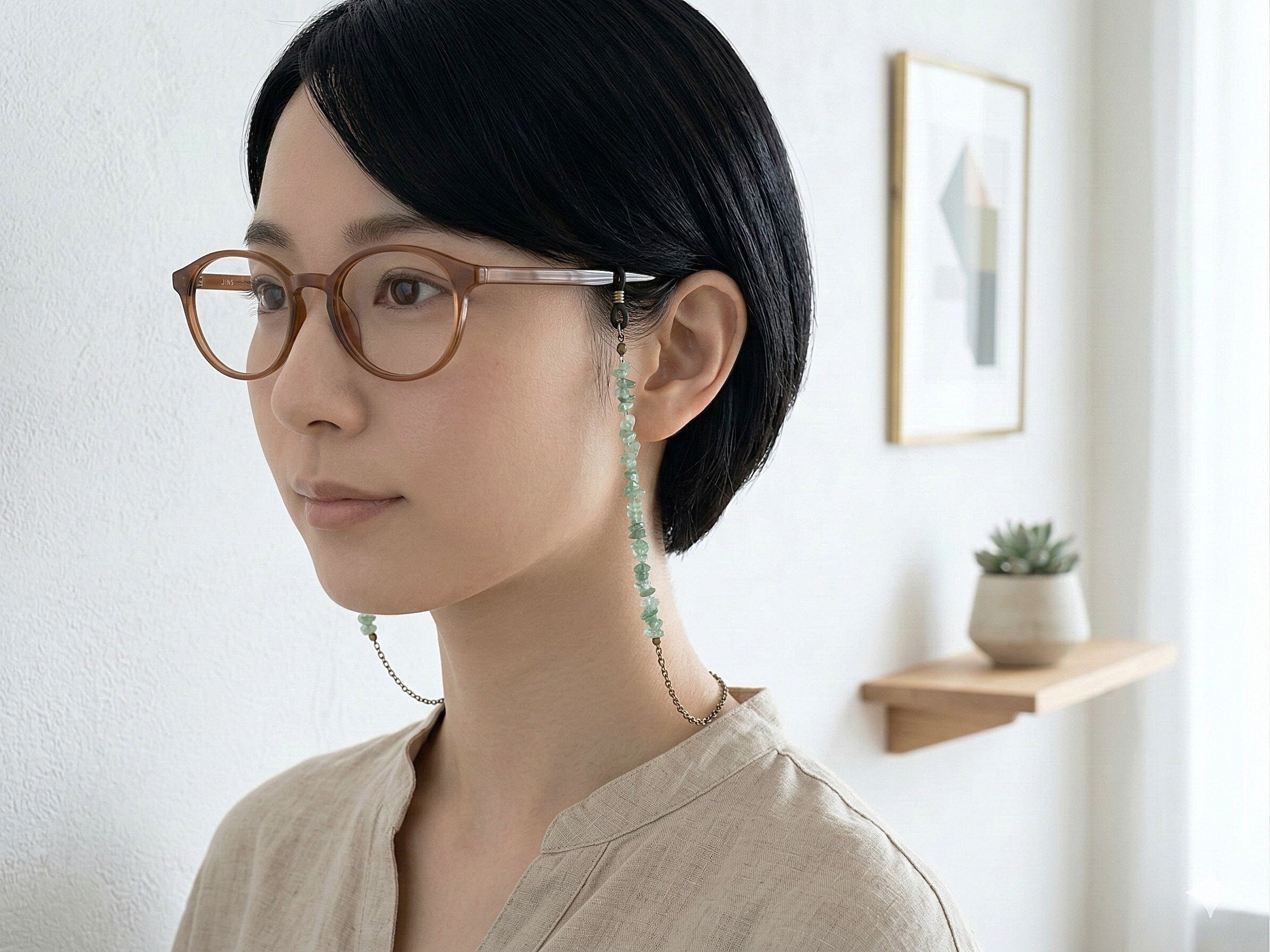 エメラルドとメタルチェーンを組み合わせた個性的なデザインが魅力のグラスコード。チップ状のエメラルドとその間にアトランダムに配置された粒ビーズが繊細で洗練された印象を与え、さらにメタルチェーンとの組み合わせはエレガントさをプラスしてより幅広いコーディネートにマッチします。